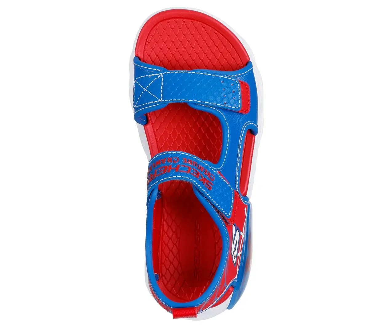 Bring on the ferocious fun wearing Skechers Creature-Splash. This sporty creature-themed sandal features a synthetic upper, Skechers adaptive closure, and a creature tech piece at the midsole.