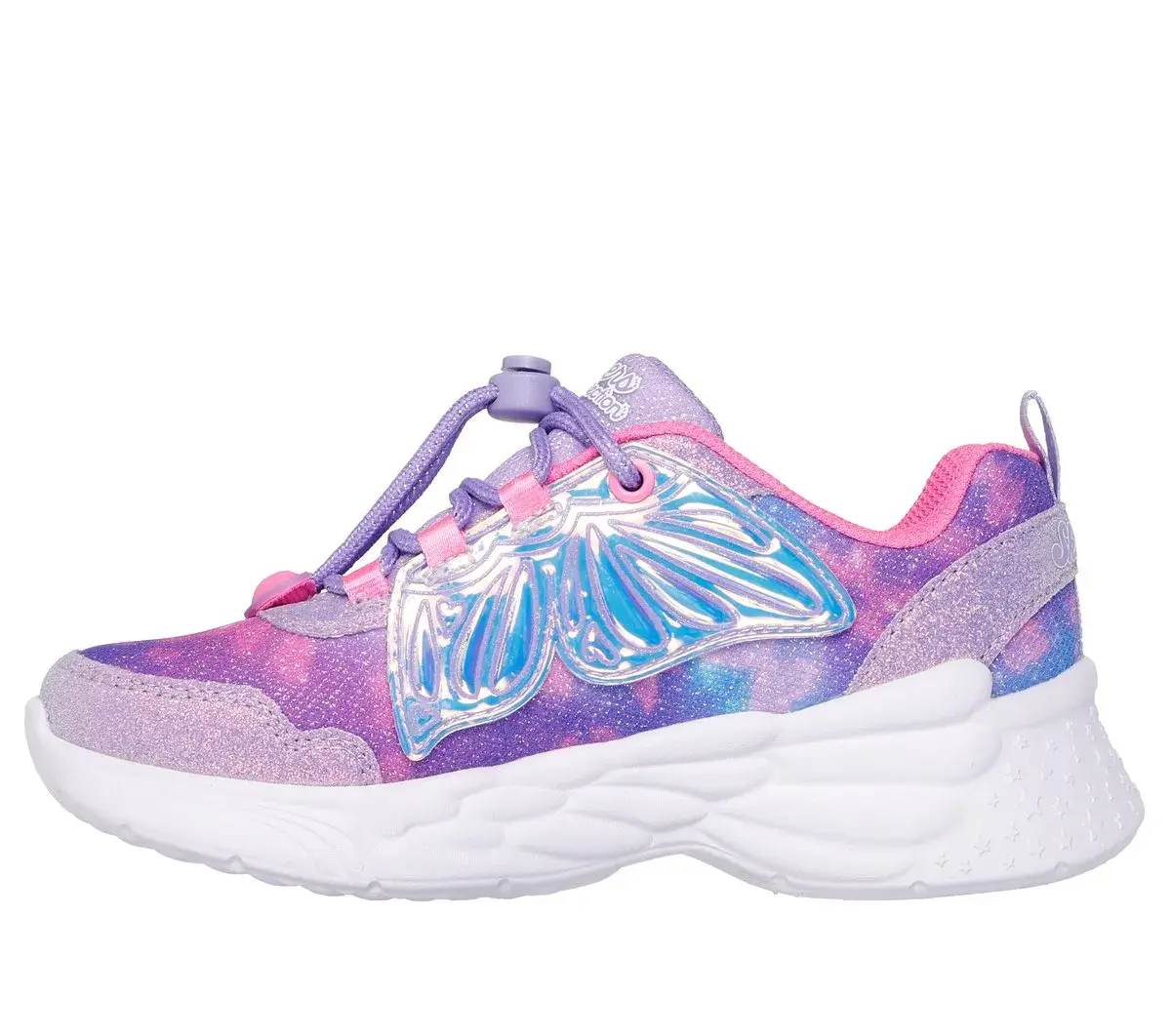 Sparkle and shine in style wearing Skechers Dream Racer – Wing Brites. This sporty Magical Collection® butterfly theme design features a synthetic and sparkle mesh upper with a stretch-laced toggle front and a cushioned comfort footbed. Bonus gift with purchase.