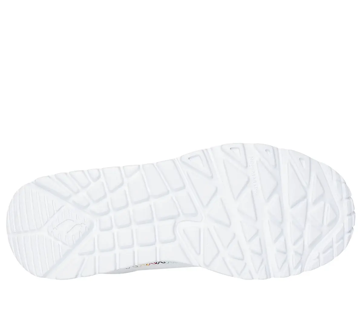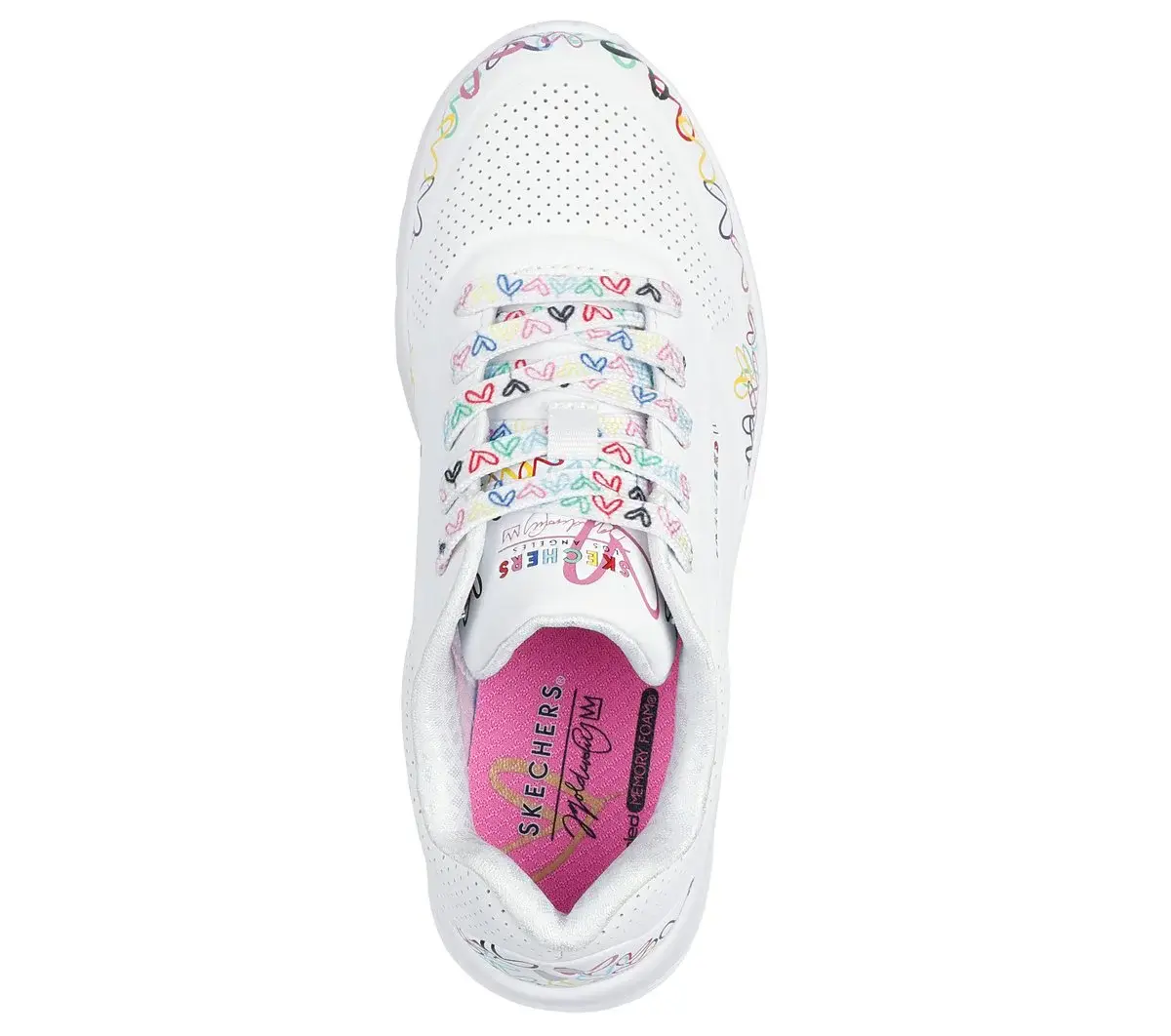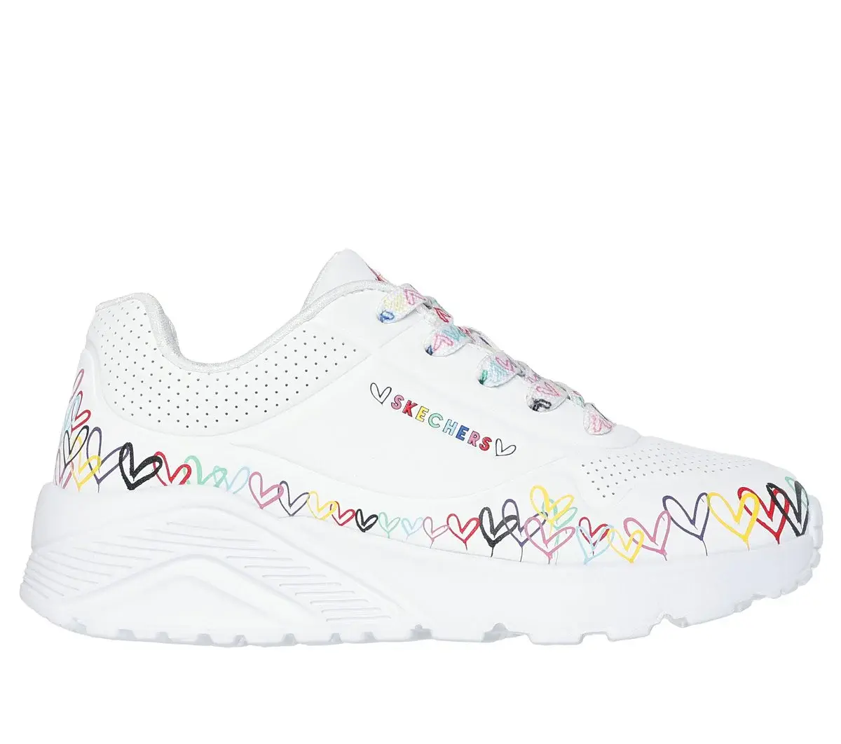 Internationally renowned muralist James Goldcrown brings his iconic #Lovewall heart designs to Skechers in this inspiring collaboration. Show your creative style with Skechers Street™ x JGoldcrown: Uno Lite – Heart Daze. This lace-up fashion sneaker features a print of the artist’s signature heart design, synthetic durabuck and perforated trimmed upper with a Skechers Air-Cooled Memory Foam® insole.