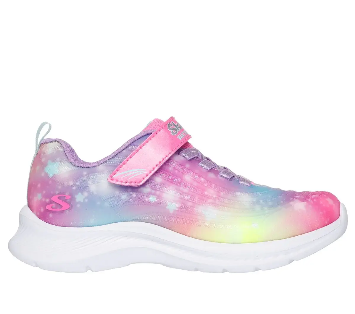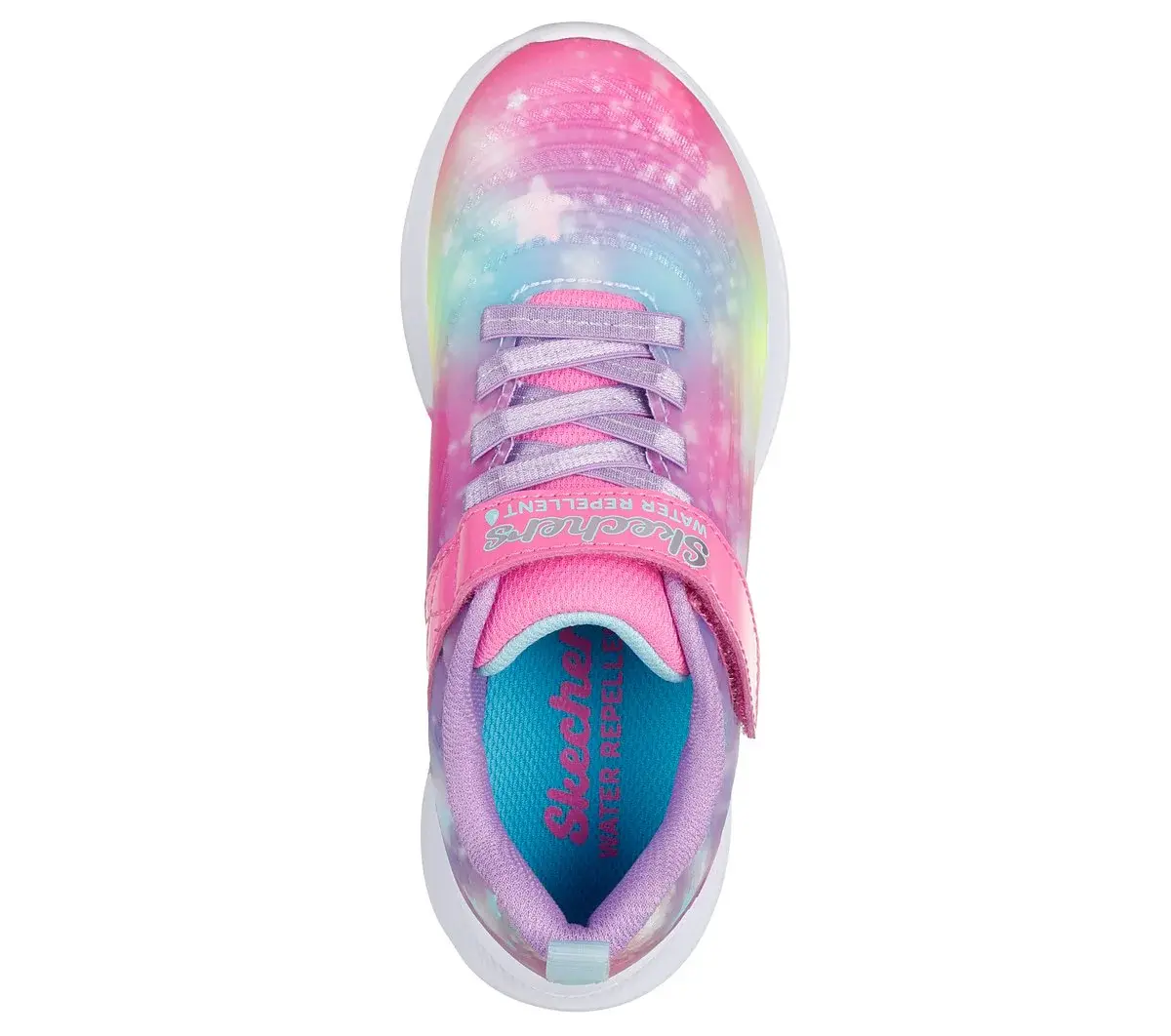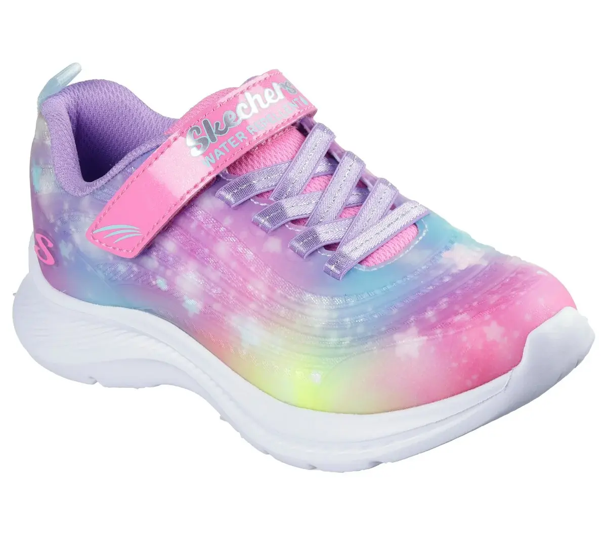 Reach for the stars in comfort and style with Skechers Jumpsters 2.0 – Horizon Sky. This water-repellent Skechers adaptive closure design features a star print synthetic upper with translucent Tuff-Tech overlays, stretch laces, and a hook-and-loop instep strap.