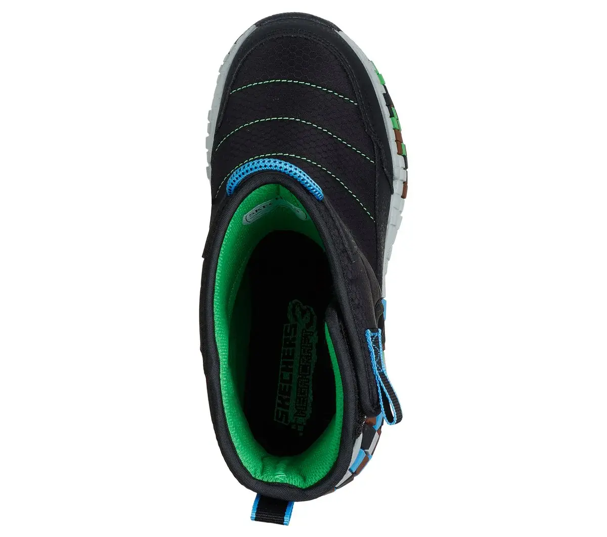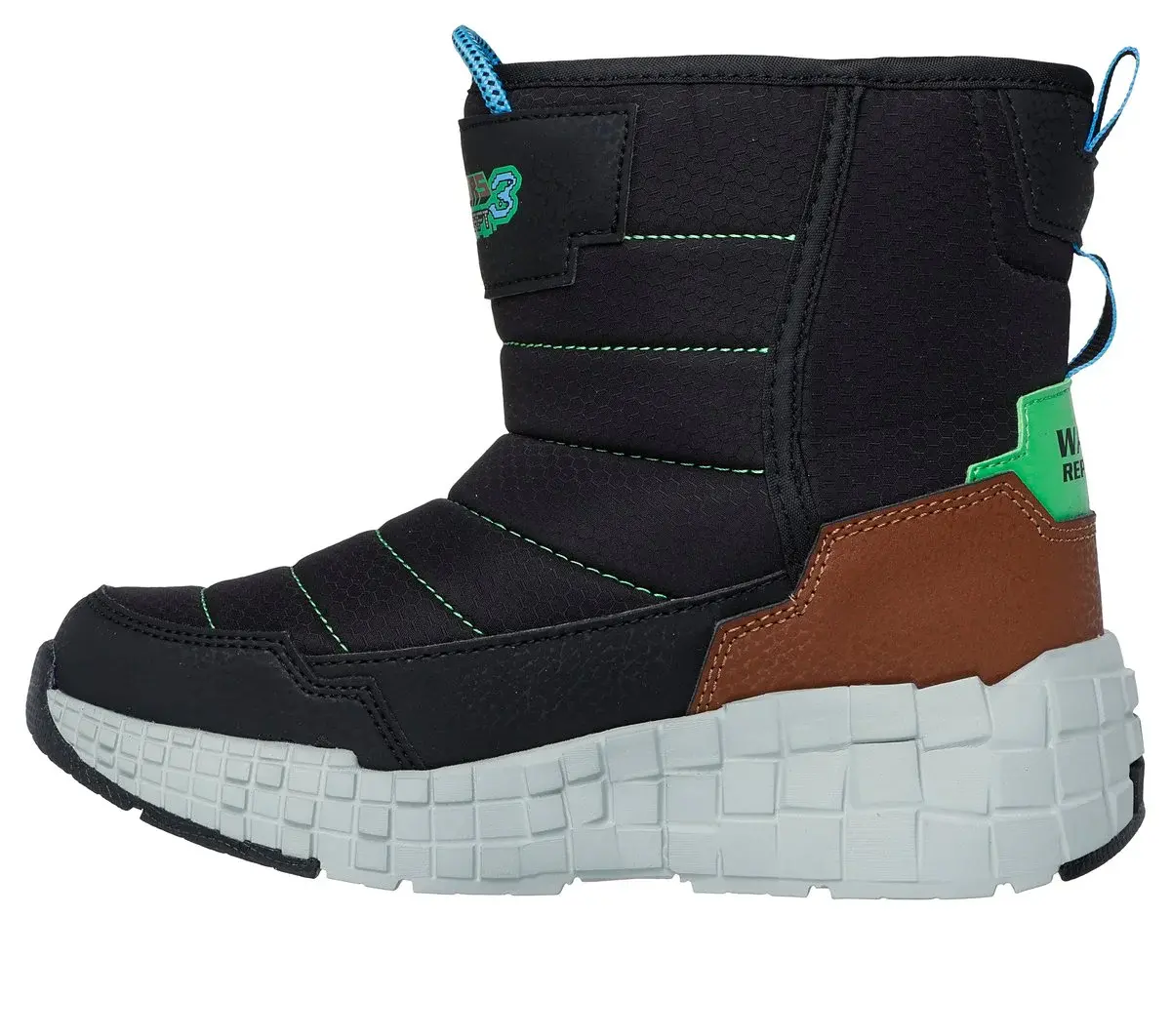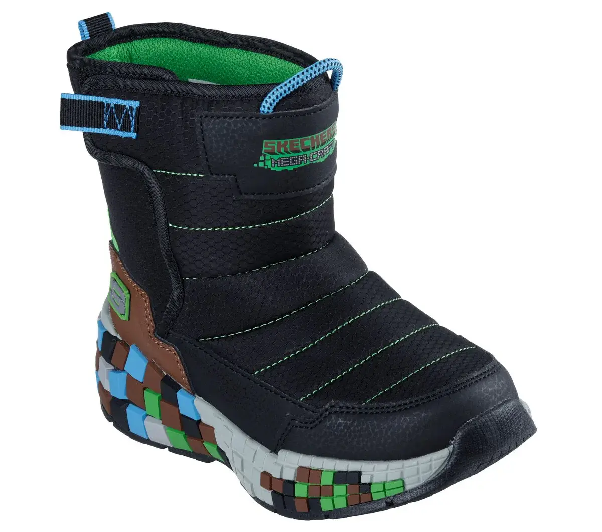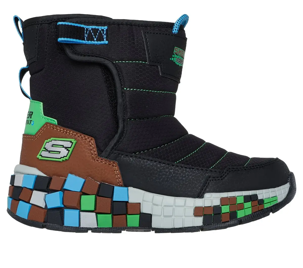 Moon boot’ vibes and block-to-block pixel looks combine in Skechers Mega-Craft® 3.0 – Cubic-Rush. This water-repellent thematic Mega-Craft® sneaker boot features a padded, synthetic textile upper with faux-leather overlays, Skechers adaptive closure panel, and a fun tech-pieced midsole.