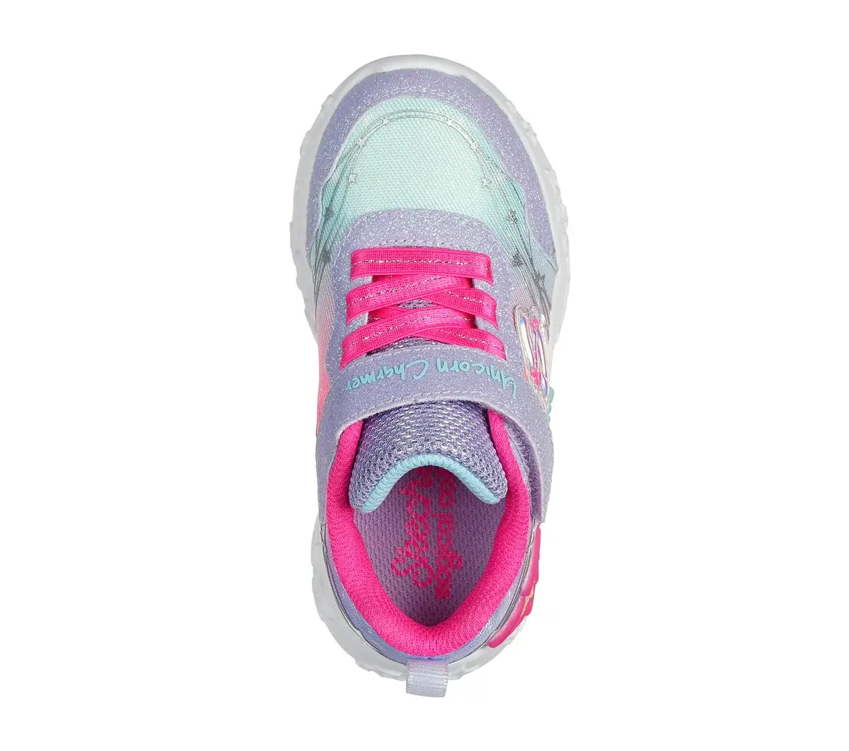 Brighten up their steps with a little unicorn magic in Skechers Unicorn Charmer – Lil Stellar. This light-up design features an ombre sheen mesh upper with star foil print, a light-up sculpted unicorn midsole and a cushioned comfort insole.