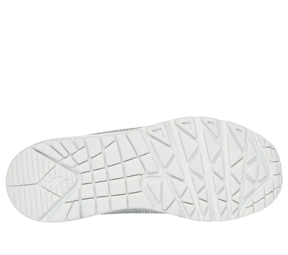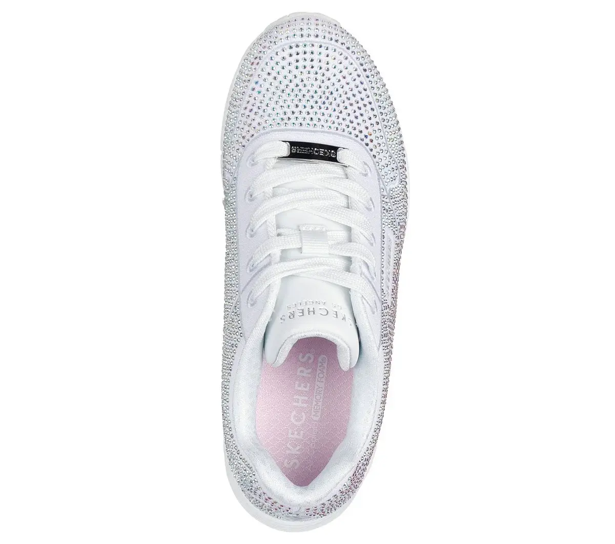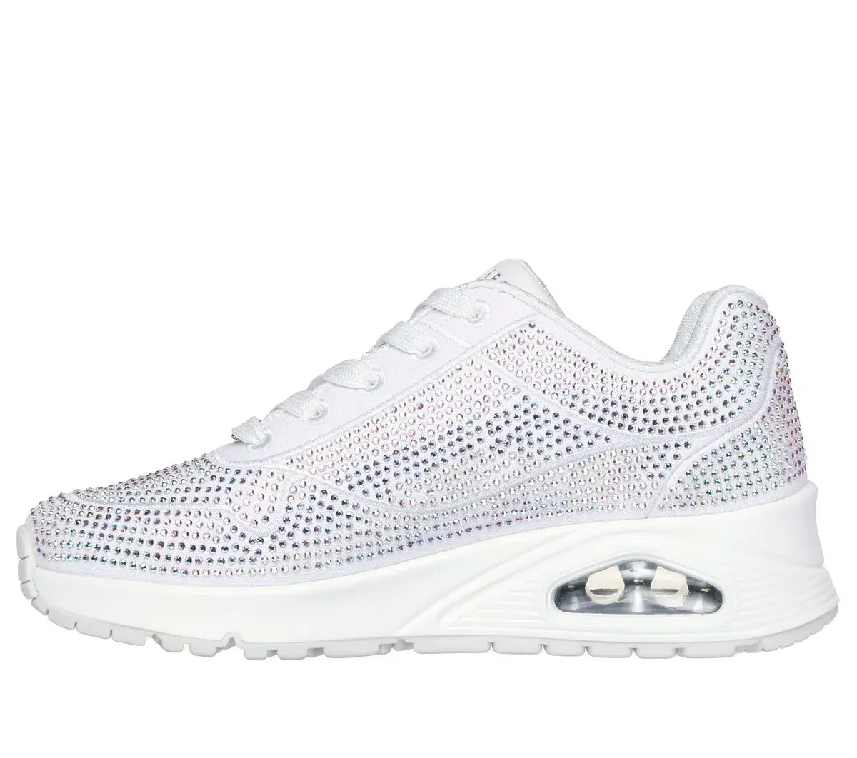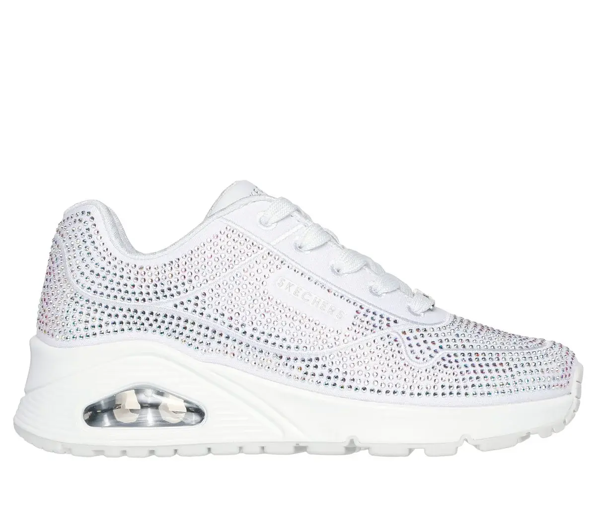Dazzle the playground in Skechers Street™ Uno Gen1 – Disco Rave. This lace-up fashion sneaker features a rhinestone-covered durabuck upper with a Skechers Air-Cooled Memory Foam® comfort insole, and a visible Skech-Air® airbag midsole.