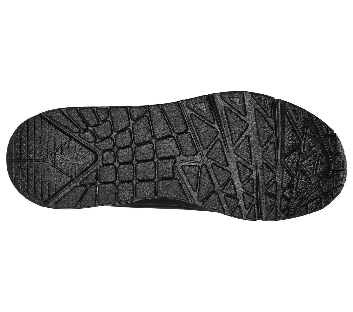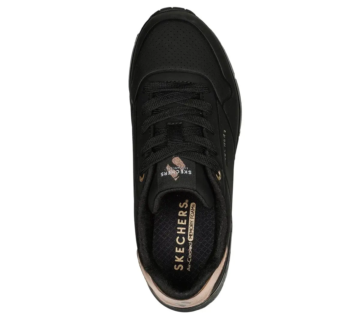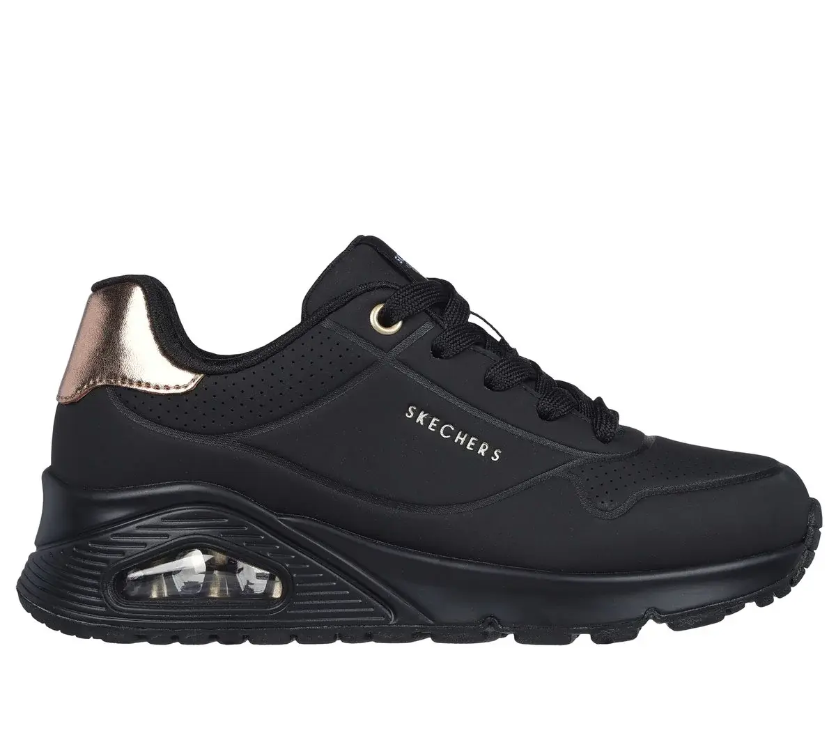 Level up your sneaker game with cushioned comfort wearing Skechers Street™ Uno Gen1 – Shimmer Away. This lace-up fashion sneaker features a synthetic duraleather upper with metallic trim, Skechers Air-Cooled Memory Foam® comfort insole, and a visible Skech-Air® airbag midsole.