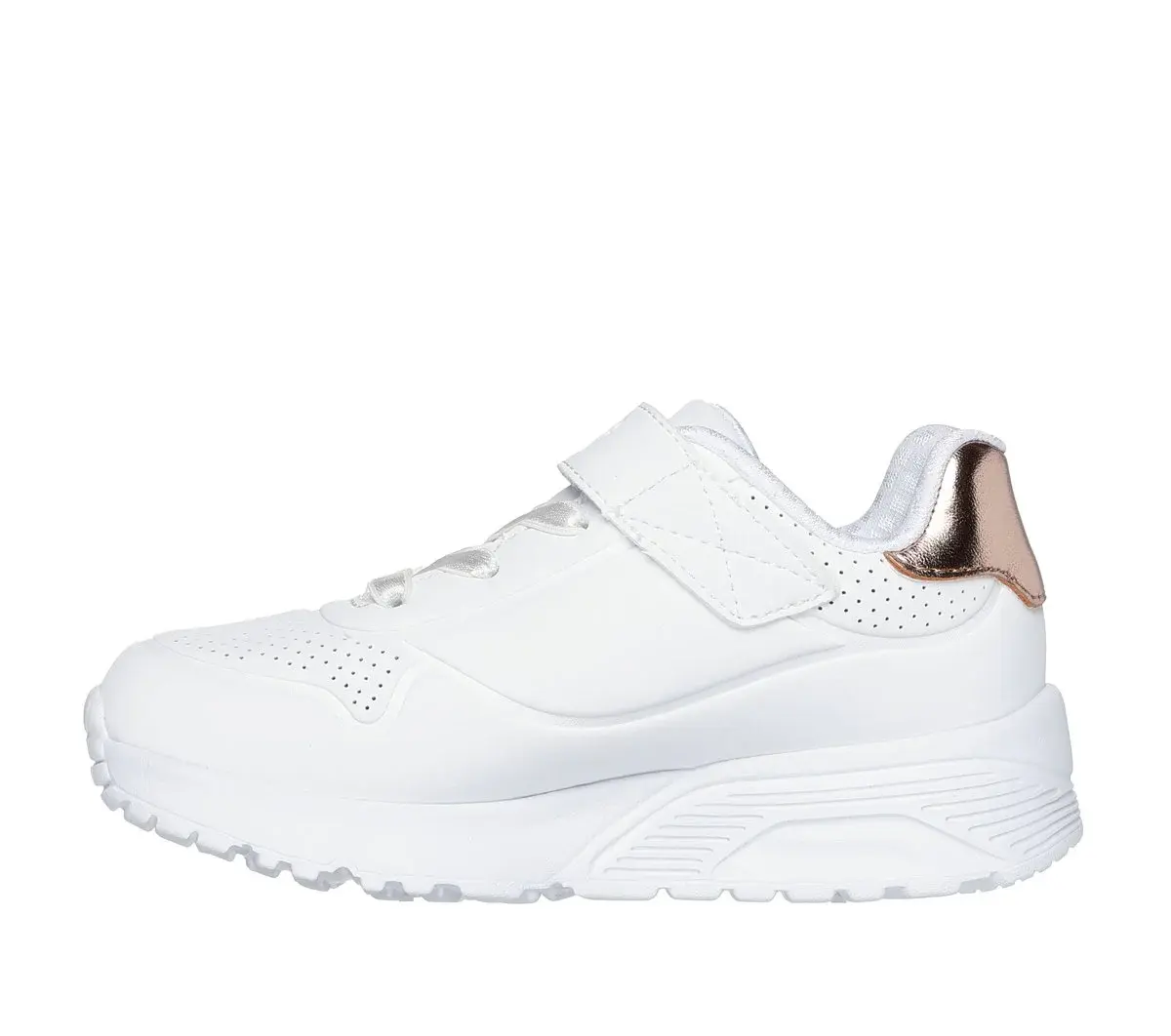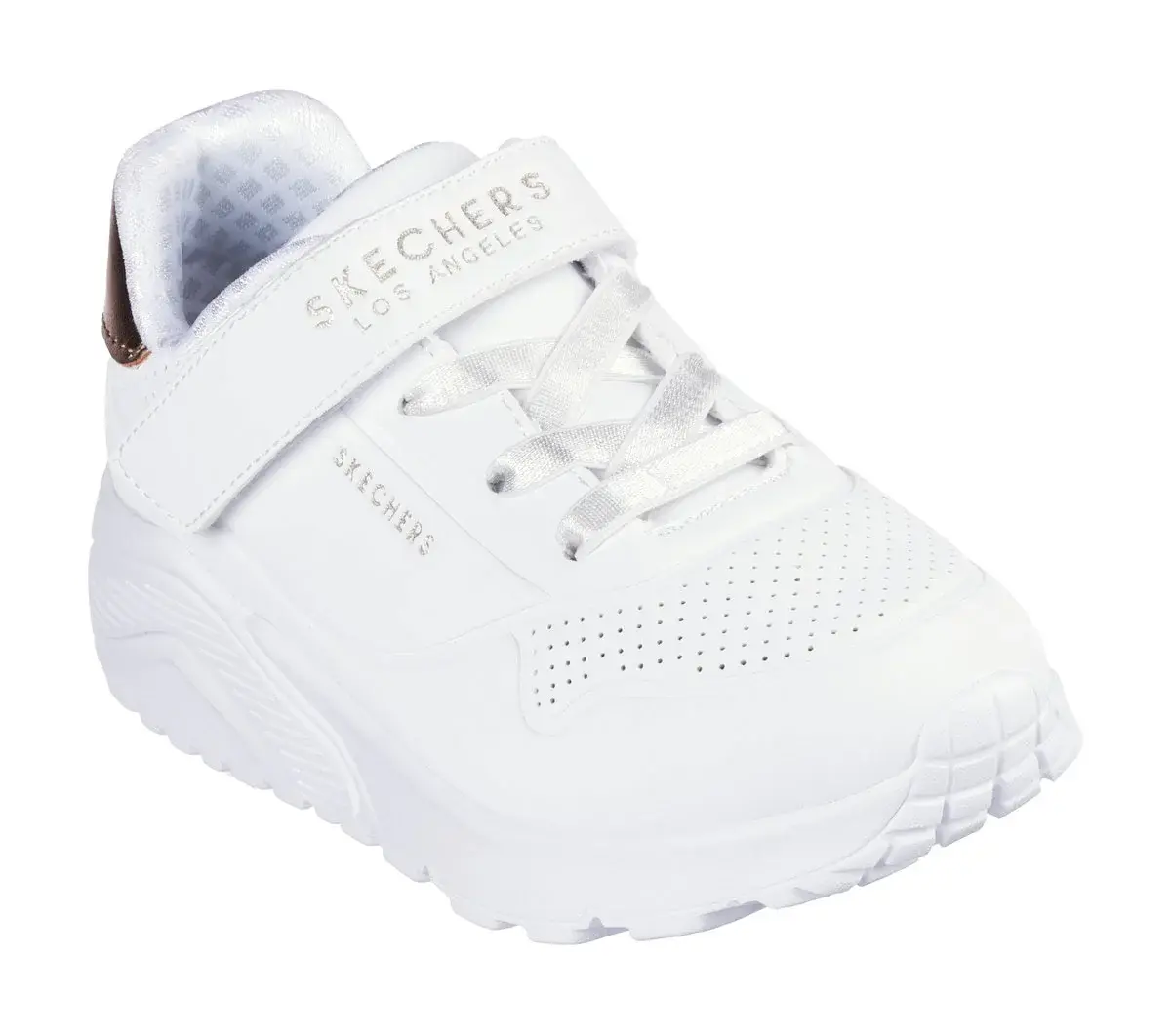 Classic sporty style meets comfort in Skechers Street™ Uno Lite – Precious Shimmer. This fashion sneaker features a smooth durabuck upper with metallic trim, stretch laces, Skechers adaptive closure, cushioned insole, and platform wedge midsole.