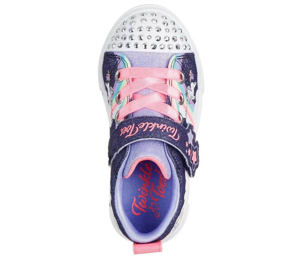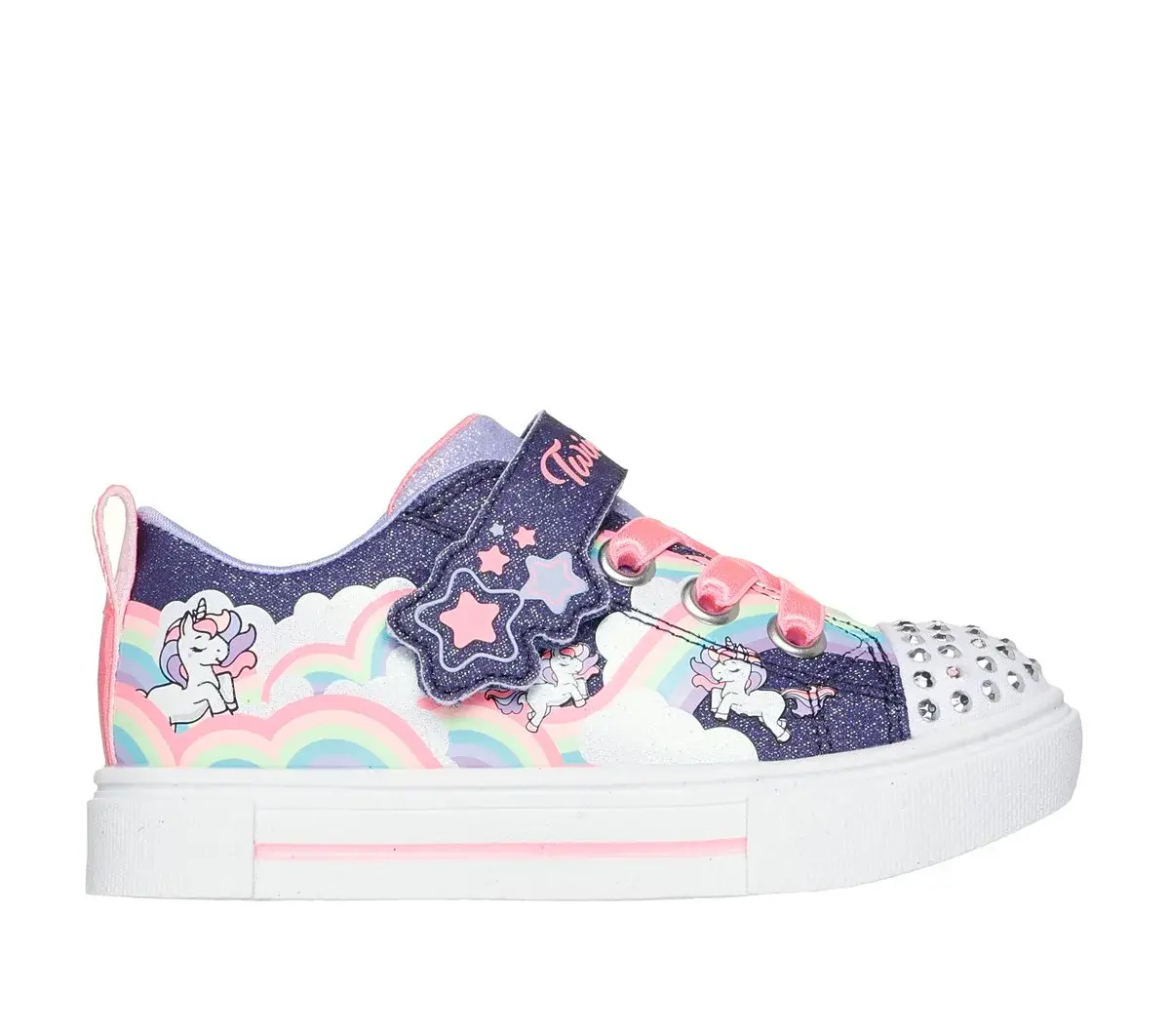 Take to the skies in magical unicorn style wearing Skechers Twinkle Toes®: Twinkle Sparks – Jumpin’ Clouds. This glittery light-up design features a rainbow unicorn print canvas upper with stretch laces, adjustable instep strap, and a light-up rhinestone embellished toe cap.