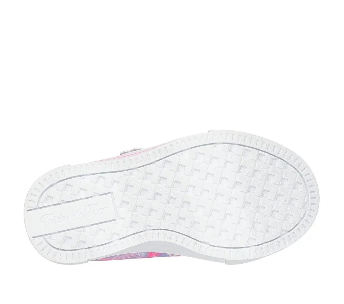 Explore the shores in magical seashell style wearing Skechers Twinkle Toes®: Twinkle Sparks – Underwater Magic. This glittery light-up design features a seashell print canvas upper with stretch laces, adjustable instep strap, and a light-up rhinestone embellished toe cap.