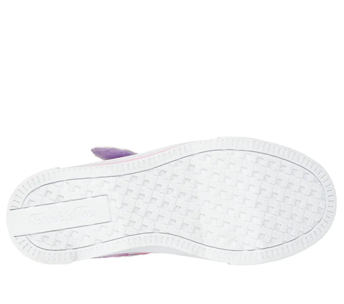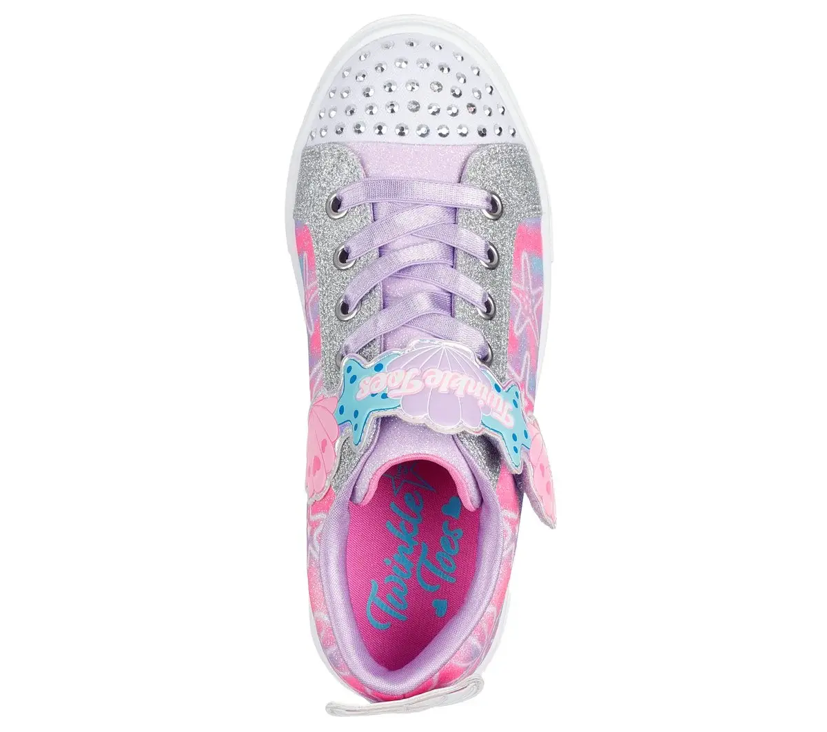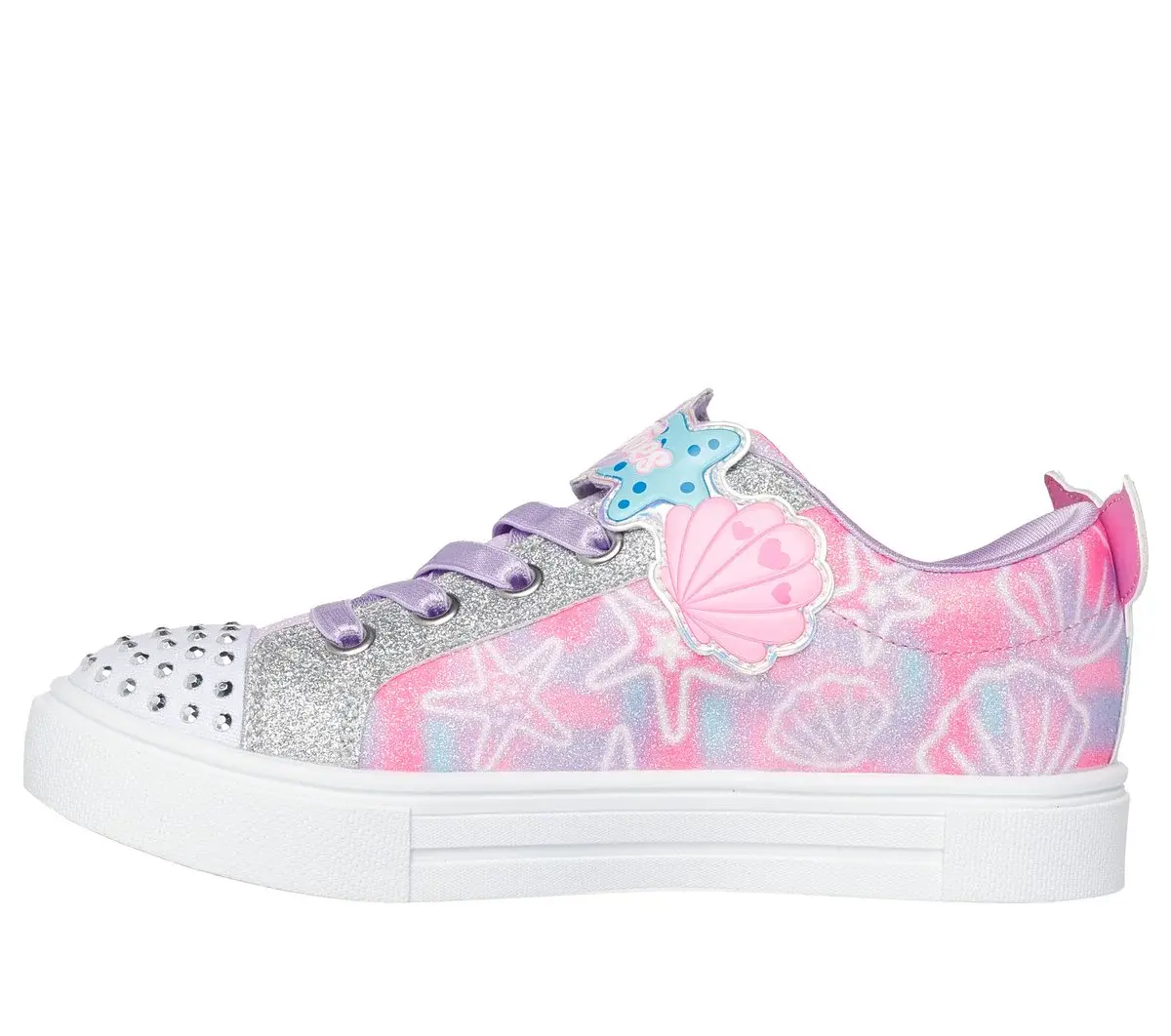 Explore the shores in magical seashell style wearing Skechers Twinkle Toes®: Twinkle Sparks – Underwater Magic. This glittery light-up design features a seashell print canvas upper with stretch laces, adjustable instep strap, and a light-up rhinestone embellished toe cap.