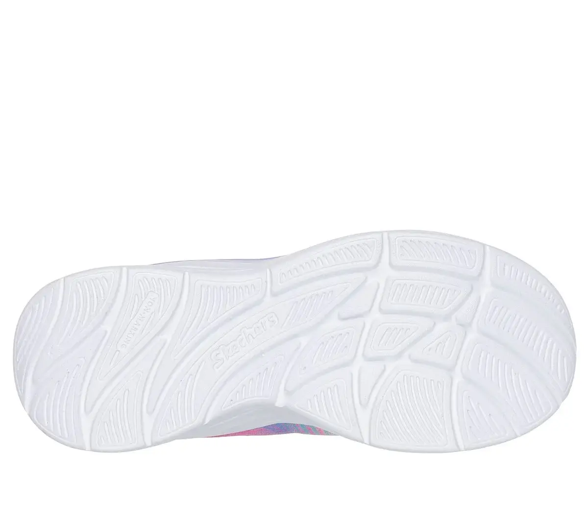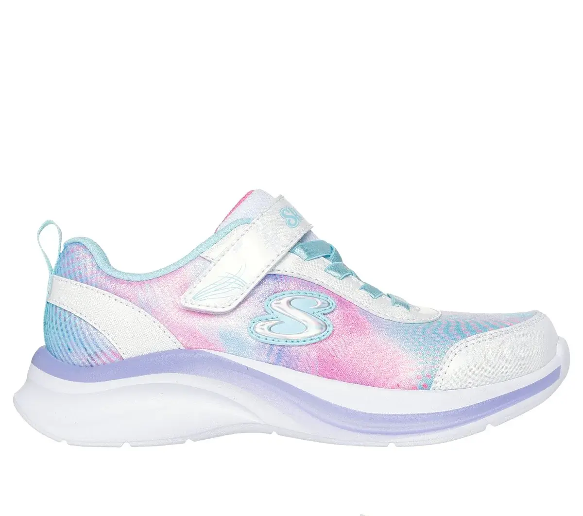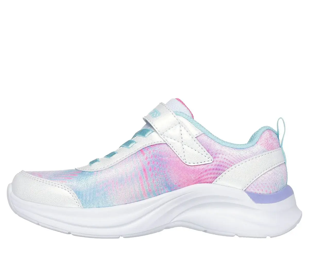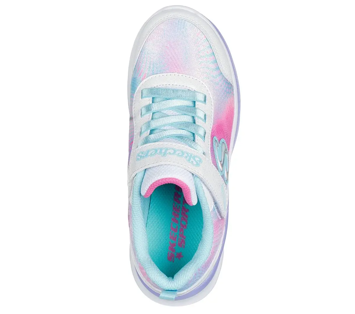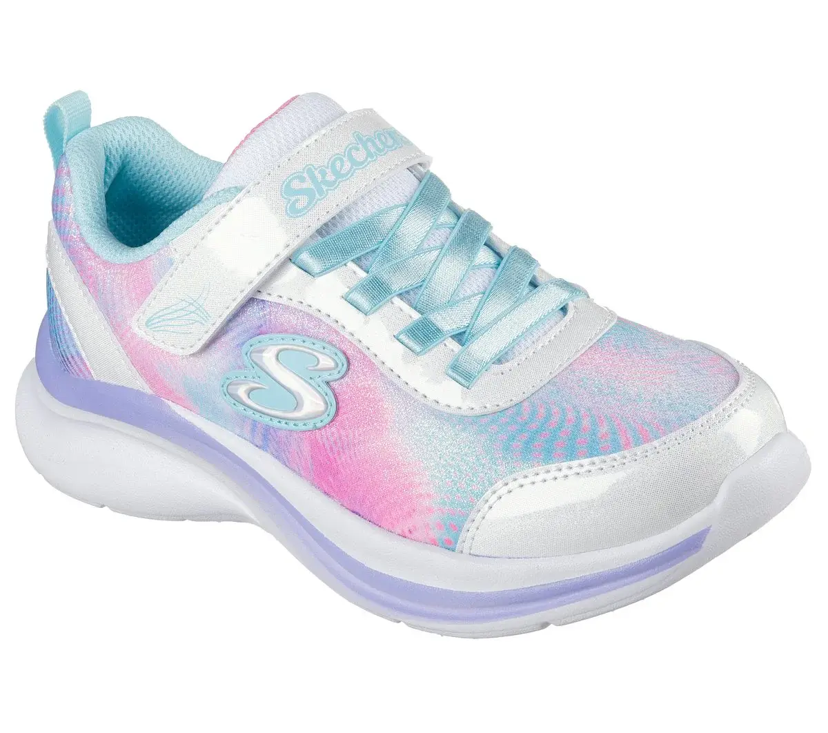 Dash through playtime in Colorful Comfort® with Skechers Aloha Dream. This vibrant design features a gradient sparkle mesh and patent glitter upper with flat stretch laces, an adjustable instep strap, and a cushioned comfort insole.