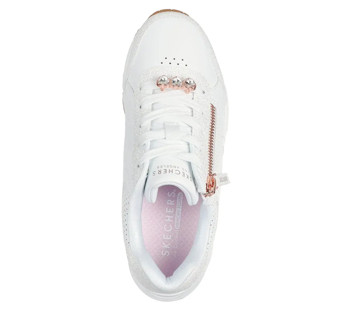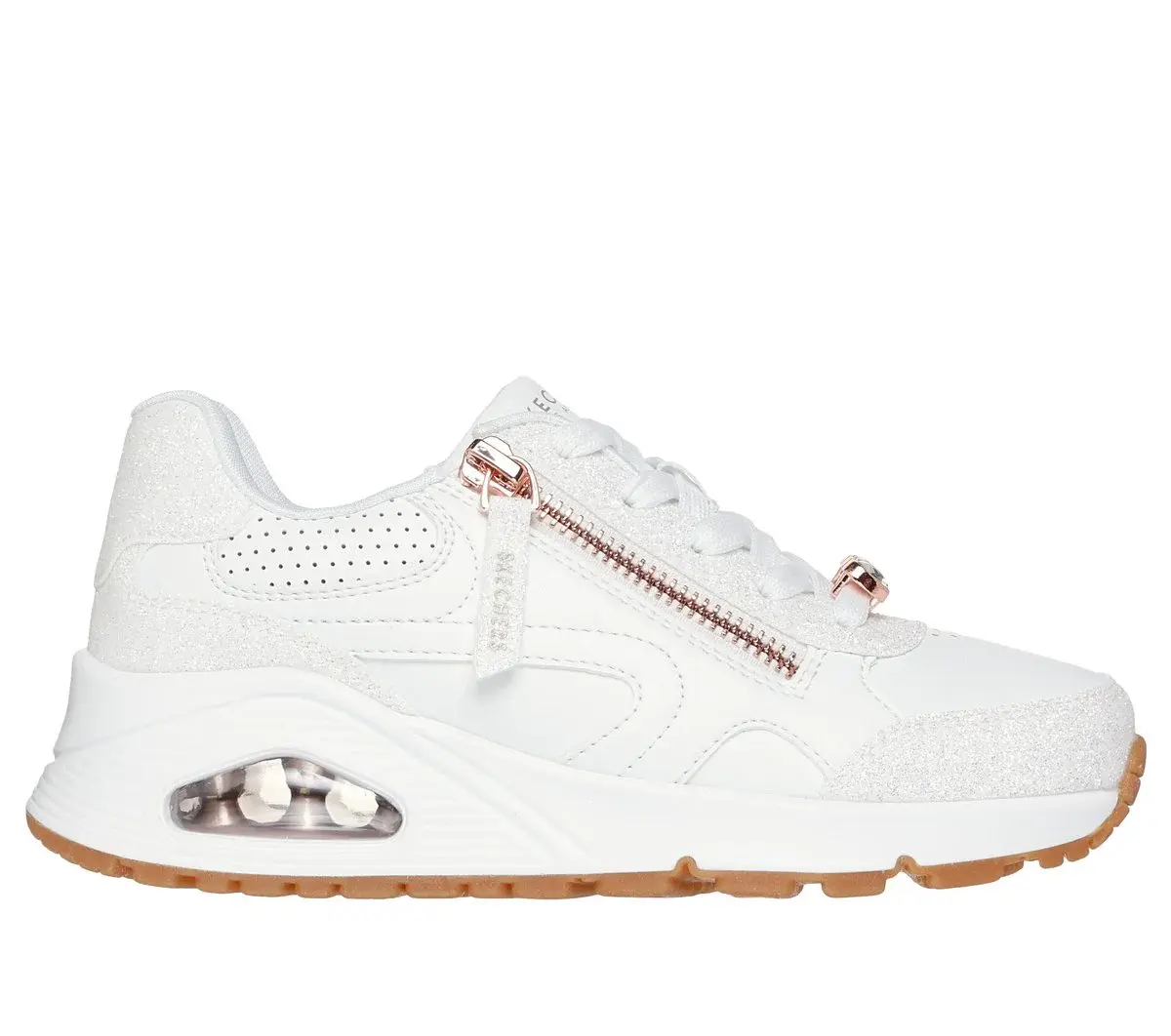 Sparkle with every cushioned step wearing Skechers Street™ Uno Gen1 – Gem Style. This lace-up Skechers adaptive closure design features a synthetic upper with glittery overlays, a quarter zip closure, a Skechers Air-Cooled Memory Foam® comfort insole, and a visible Skech-Air® airbag midsole.