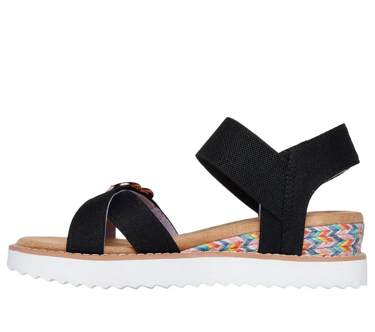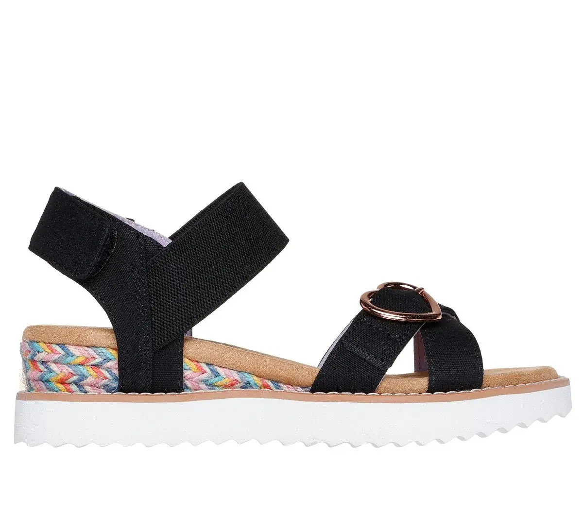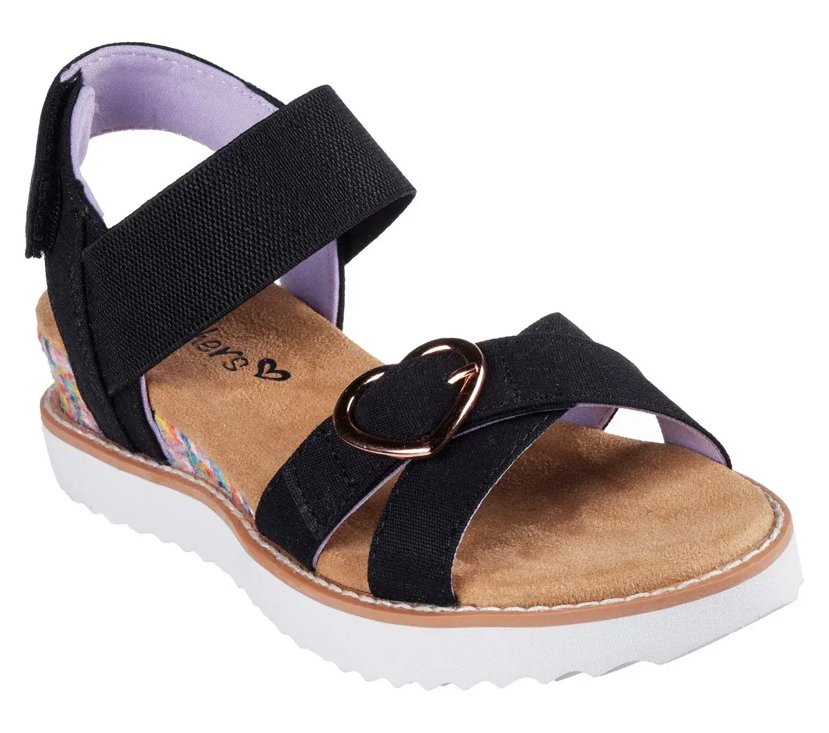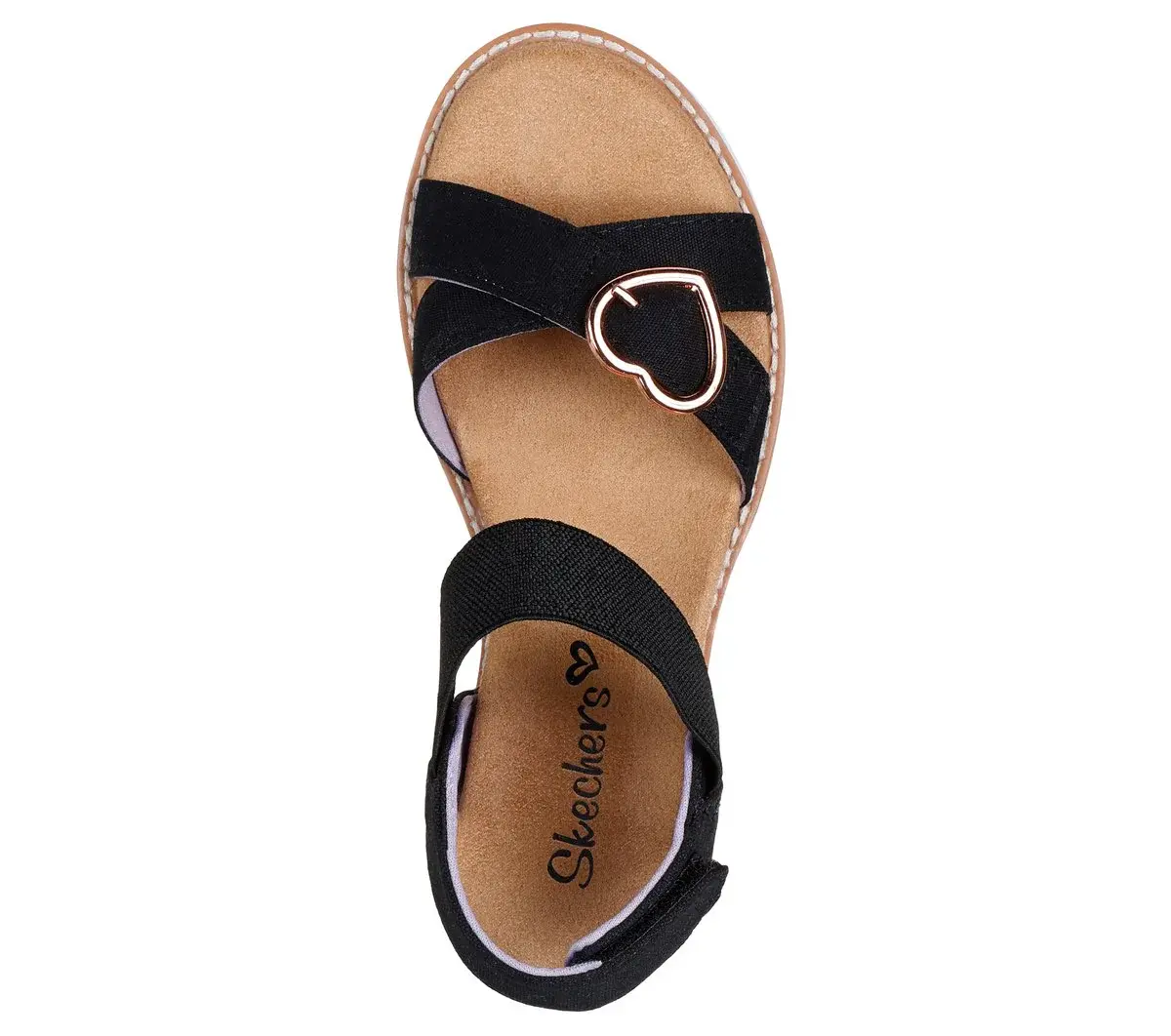 Style in breezy style and comfort with Skechers Miss Desert Kiss HI. This strappy comfort sandal features a woven fabric upper with a heart buckle and cushioned Skechers Memory Foam™ footbed.
