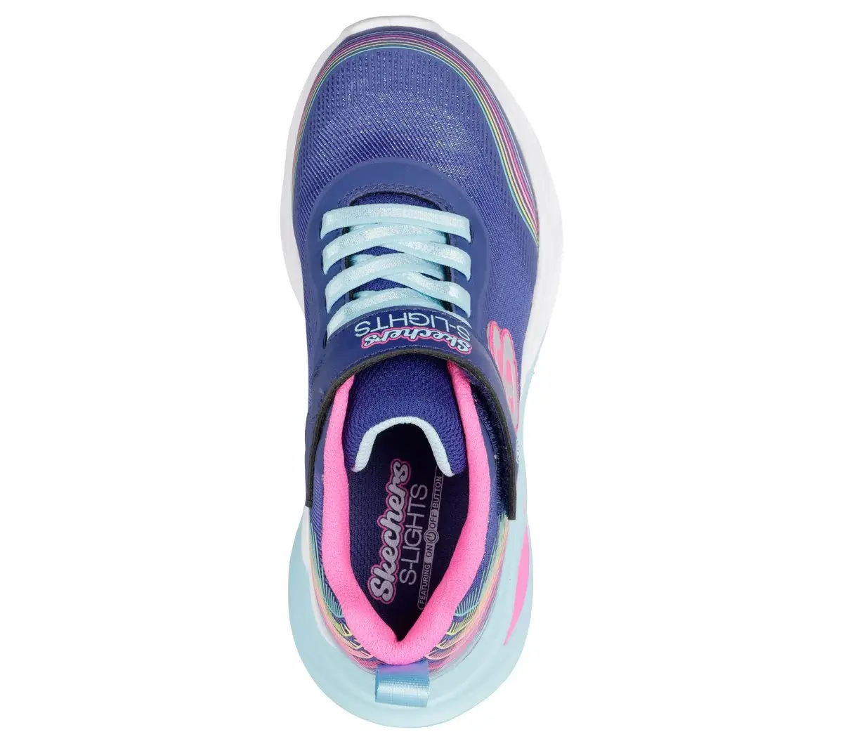 Step into a world of color and comfort wearing Skechers S-Lights®: Cosmic Glow – Rainbow Dream. This light-up Skechers adaptive closure design features a sparkle mesh upper with a 3D rainbow print, fixed stretch laces, a hook-and-loop instep strap, and a well-cushioned midsole with step-activated lights.