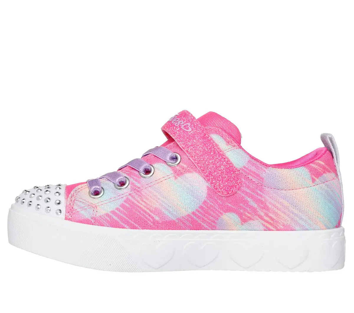 Light up every room with artful style wearing Skechers Twinkle Toes®: Heart Steps – Heart Sketch. This heart-trimmed design features a shimmer fabric upper with ‘heart sketch’ print, stretch laces, adjustable instep strap, and a light-up rhinestone-embellished toe cap.
