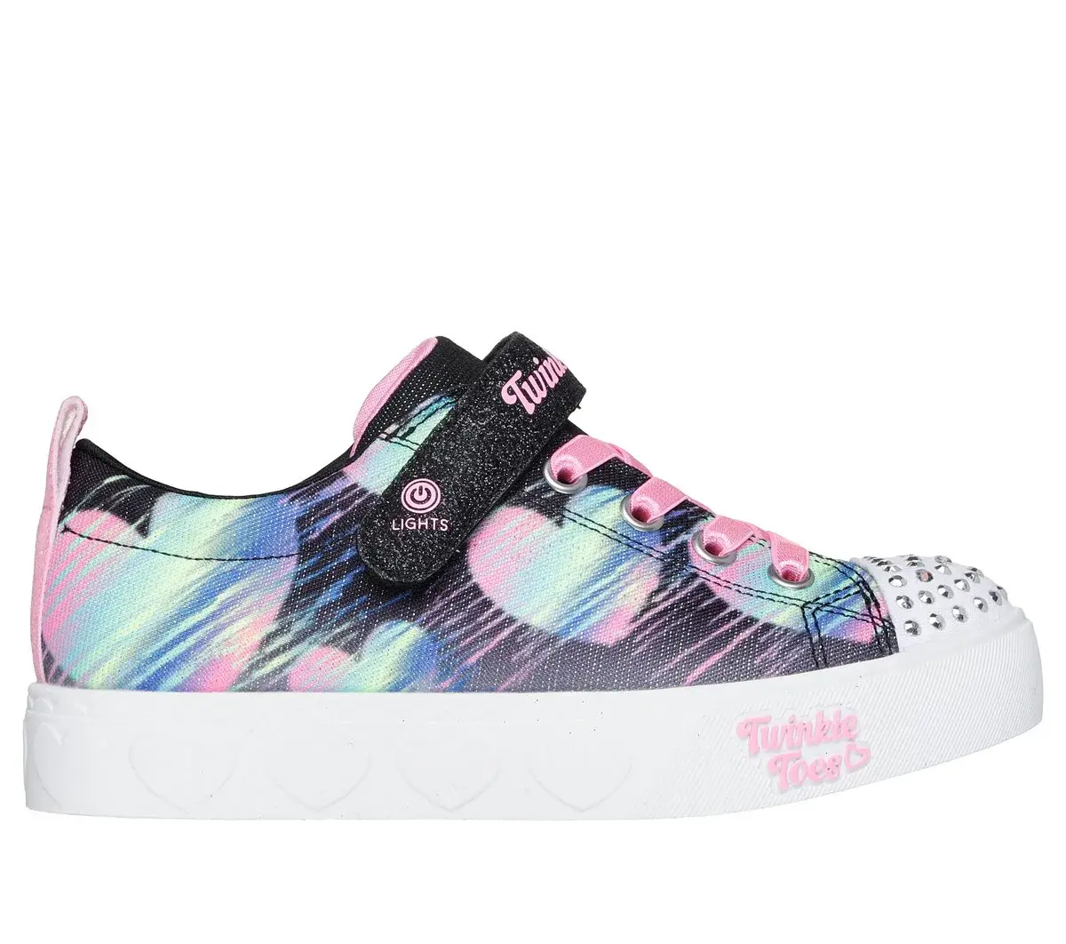 Light up every room with artful style wearing Skechers Twinkle Toes®: Heart Steps – Heart Sketch. This heart-trimmed design features a shimmer fabric upper with ‘heart sketch’ print, stretch laces, adjustable instep strap, and a light-up rhinestone-embellished toe cap.