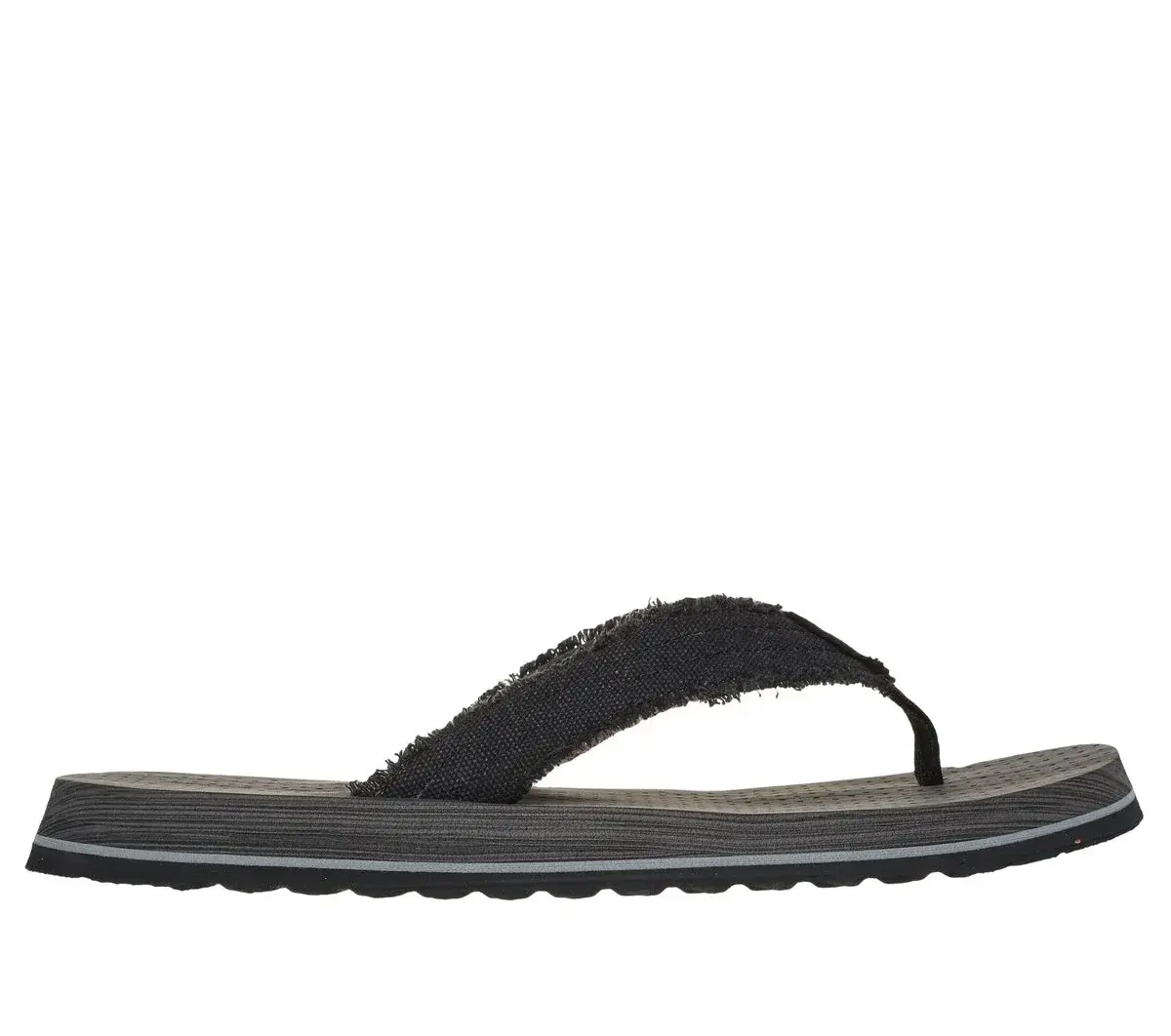 Bring on the sand, surf, and sun in Skechers Tantric – Fritz. This casual 3-point thong sandal features a frayed canvas upper with a faux woodgrain and sports stripe detailed midsole.
