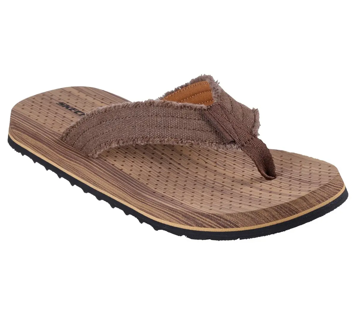 Bring on the sand, surf, and sun in Skechers Tantric – Fritz. This casual 3-point thong sandal features a frayed canvas upper with a faux woodgrain and sports stripe detailed midsole.