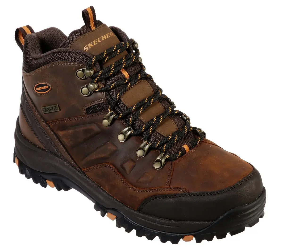 Forge ahead in rugged trail-ready style and comfort with Skechers Relaxed Fit®: Relment – Traven. This lace-up hiking style ankle boot features a waterproof durable smooth leather, synthetic and mesh upper with cushioned Memory Foam insole.