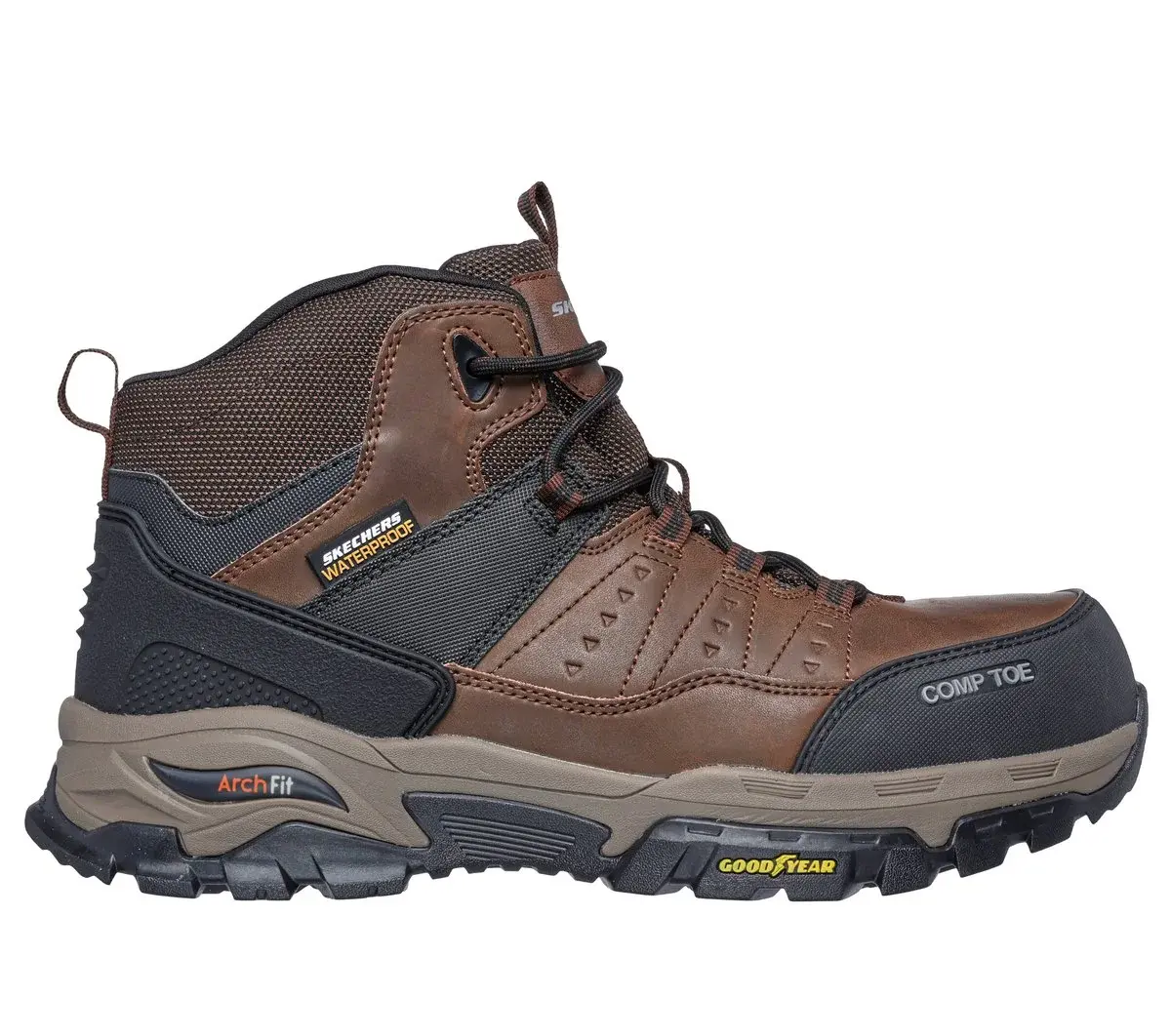Reliable safety and all-day comfort deliver in Skechers Work™: Arch Fit® Tarver CT. This waterproof boot features a lace-up leather, synthetic and mesh upper with a nonmetallic composite safety toe, removable Arch Fit® insole, and a slip-resistant Goodyear® Rubber Outsole.