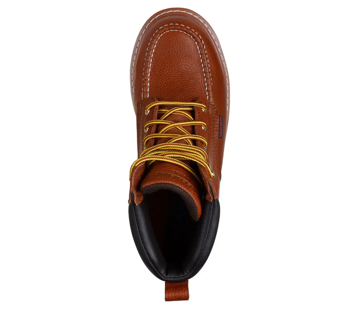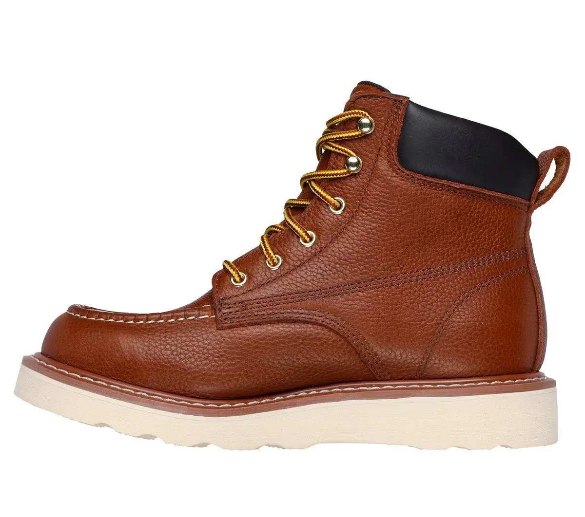 Classic leather work boot style comes to the job site in Skechers Work™: Kadmiel – Bennot. This lace-up work boot features a leather upper with a synthetic padded collar, a cushioned Air-Cooled Memory Foam® insole, and a durable Goodyear welt midsole.