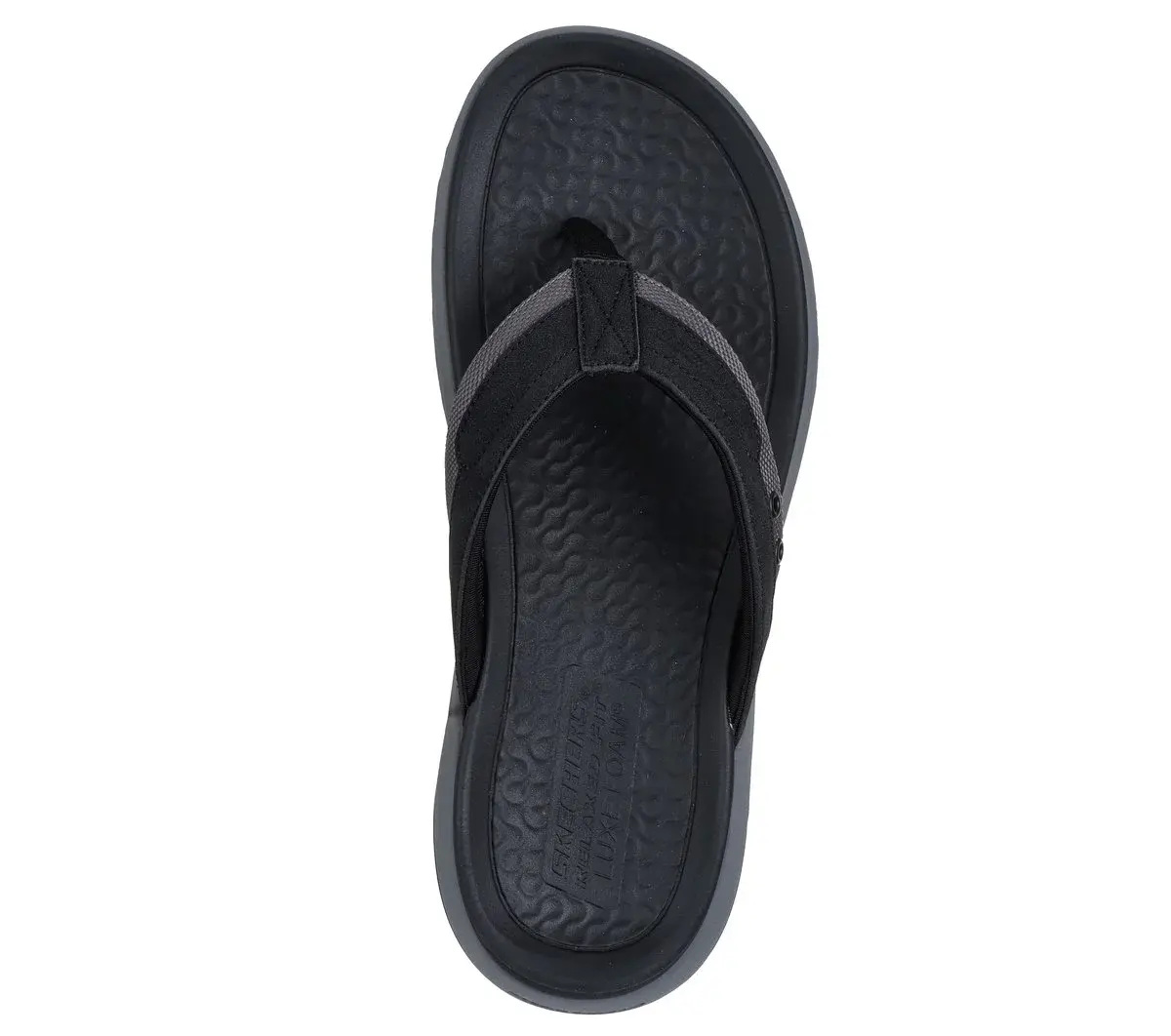 Bring on the sand, surf, and sun in Skechers Relaxed Fit®: Silva – Falco. This roomy 3-point thong sandal features a smooth vegan leather and mesh upper with eyelet detail and a contoured Luxe Foam® footbed.