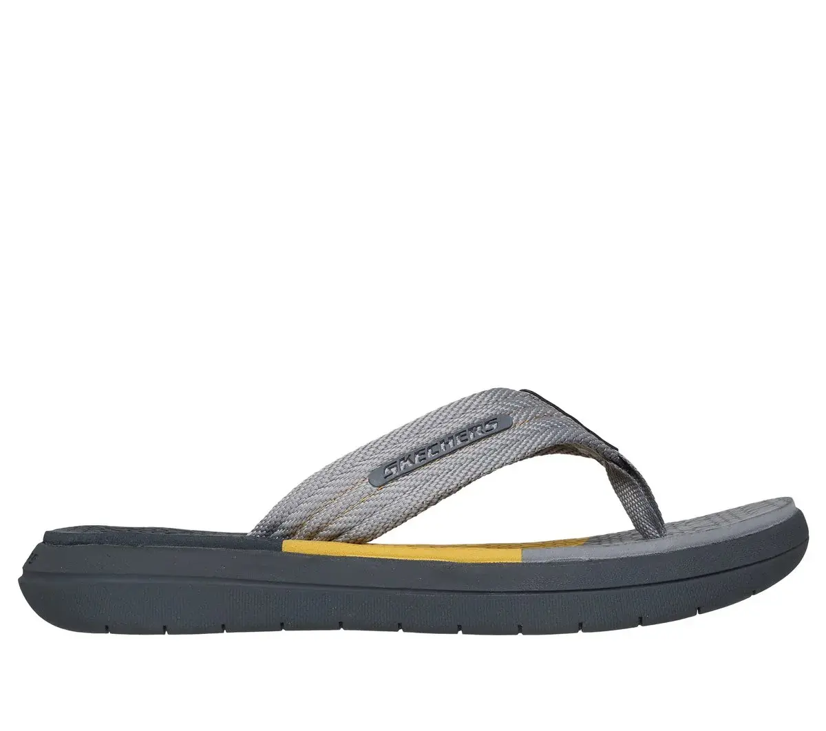 Bring on the sand, surf, and sun in Skechers Relaxed Fit®: Voreno Codie. This roomy 3-point thong sandal features a woven canvas upper and a contoured Luxe Foam® footbed.