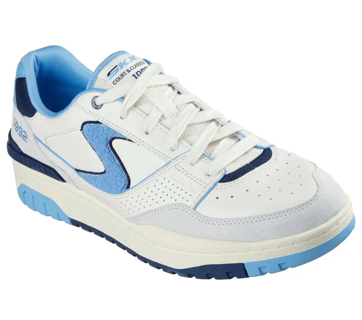 Walk through time in throwback style and classic comfort wearing Skechers S-1992. This retro-inspired lace-up features a leather, pig suede, and mesh upper with a chenille logo detail and a cushioned Skechers Air-Cooled Memory Foam® insole.