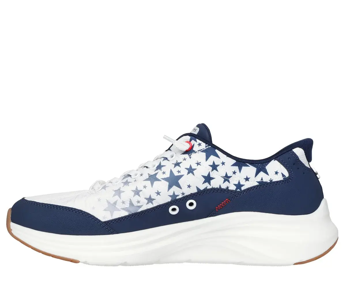 Feel the freedom of well-cushioned comfort with Skechers Hands Free Slip-ins®: Contour Foam™ – Cozy Fit™ Cozica. Designed with our exclusive Heel Pillow™, this patriotic slip-on features a star print quilted upper with synthetic overlays, tied-off stretch laces, Contour Foam™ midsole cushioning, and our signature cushioned Skechers Air-Cooled Memory Foam® insole.
