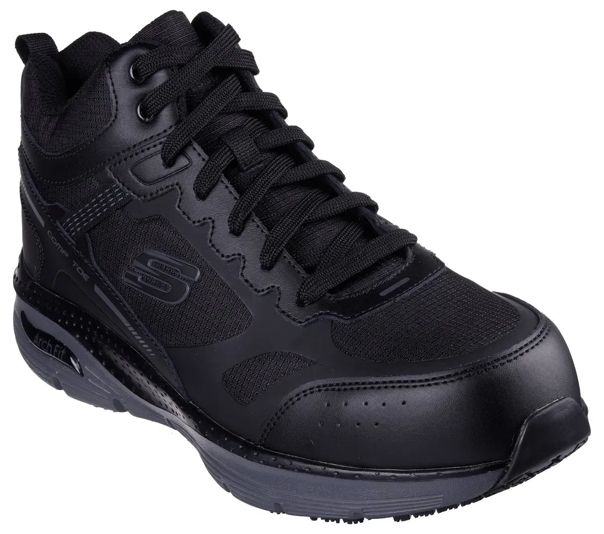 Move throughout your day in safety and supportive comfort wearing Skechers Work™: Arch Fit® Slip-Resistant – Pyreford. This lace-up high-top has been granted the APMA Seal of Acceptance and features a leather, textile, and mesh upper with a composite nonmetallic safety toe, removable Skechers Arch Fit® insole, plus a Slip-resistant outsole.