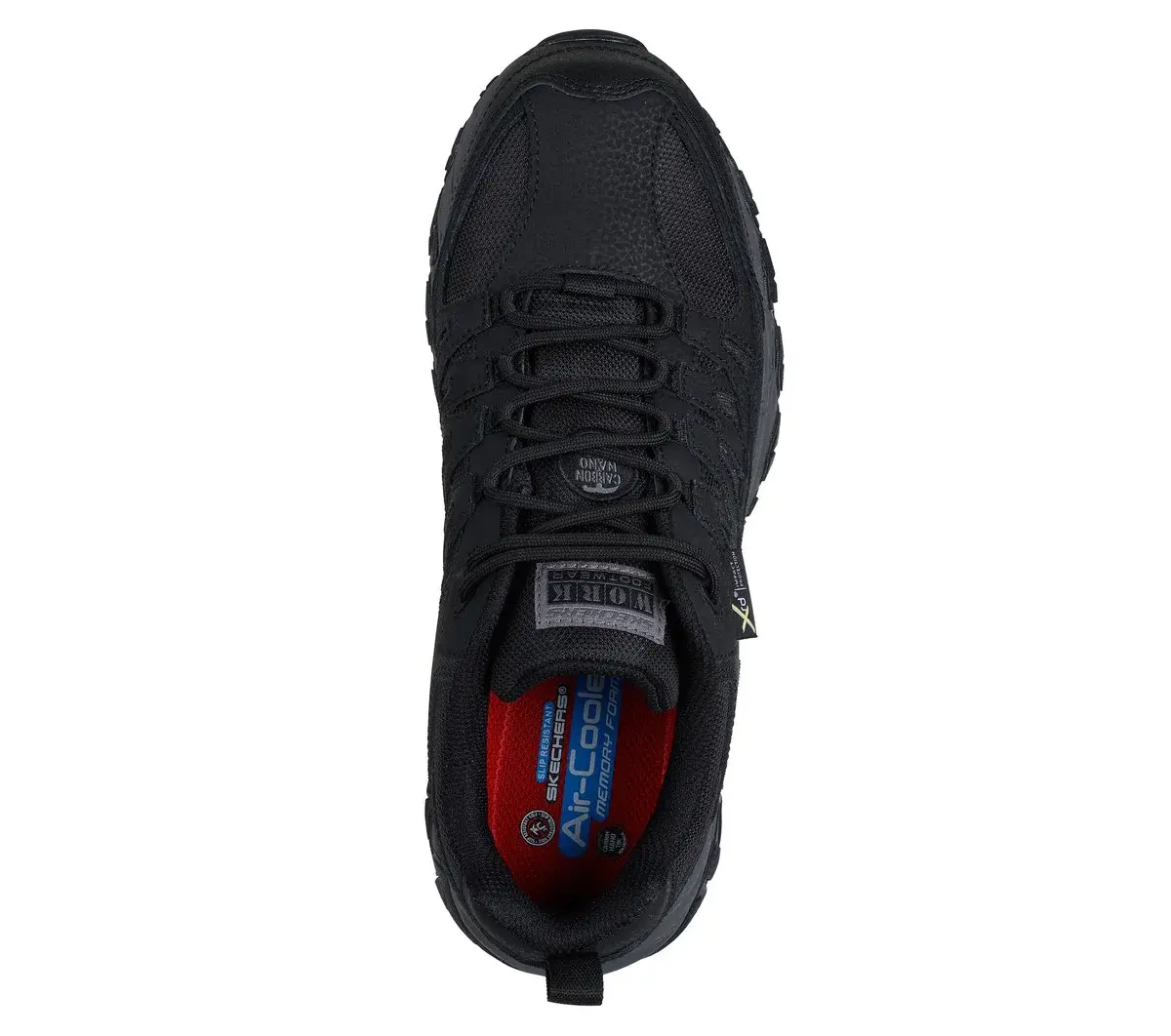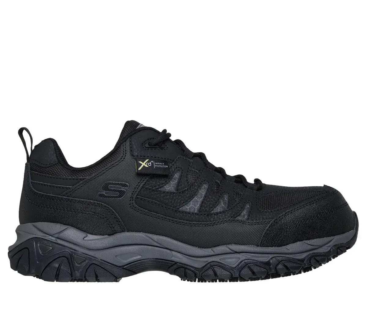 Shift into comfort and safety you can depend on in Skechers Work™: Holdredge. This durable slip-resistant style features a lace-up leather and synthetic upper with a cushioned Skechers Air-Cooled Memory Foam® comfort insole, and a carbon nano safety toe with an internal metatarsal guard.