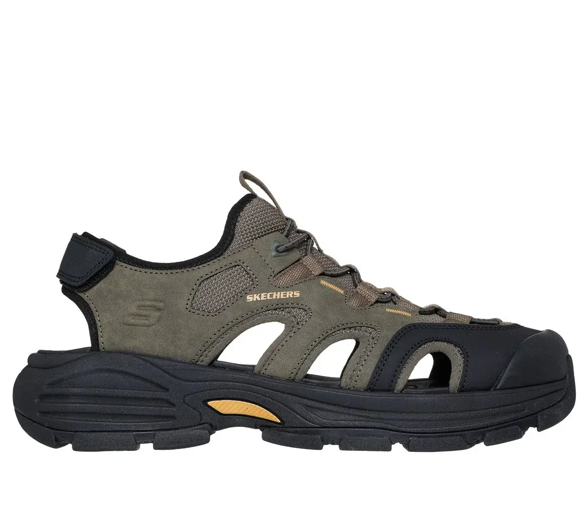 Rugged outdoor style meets modern comfort with Skechers Relaxed Fit®: Fairport – Bradley. This roomy closed-toe sandal features a mesh and synthetic overlay upper with fixed stretch laces, adjustable back strap, and a cushioned Luxe Foam® insole.