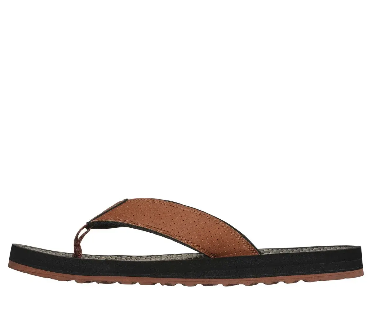 Achieve relaxation nirvana with Skechers Relaxed Fit®: Tantric – Copano. This roomy 3-point thong sandal features a perforated faux leather upper with a contoured Luxe Foam® footbed.