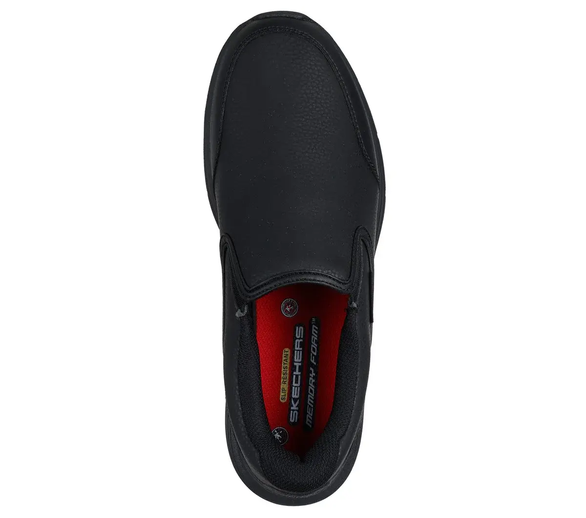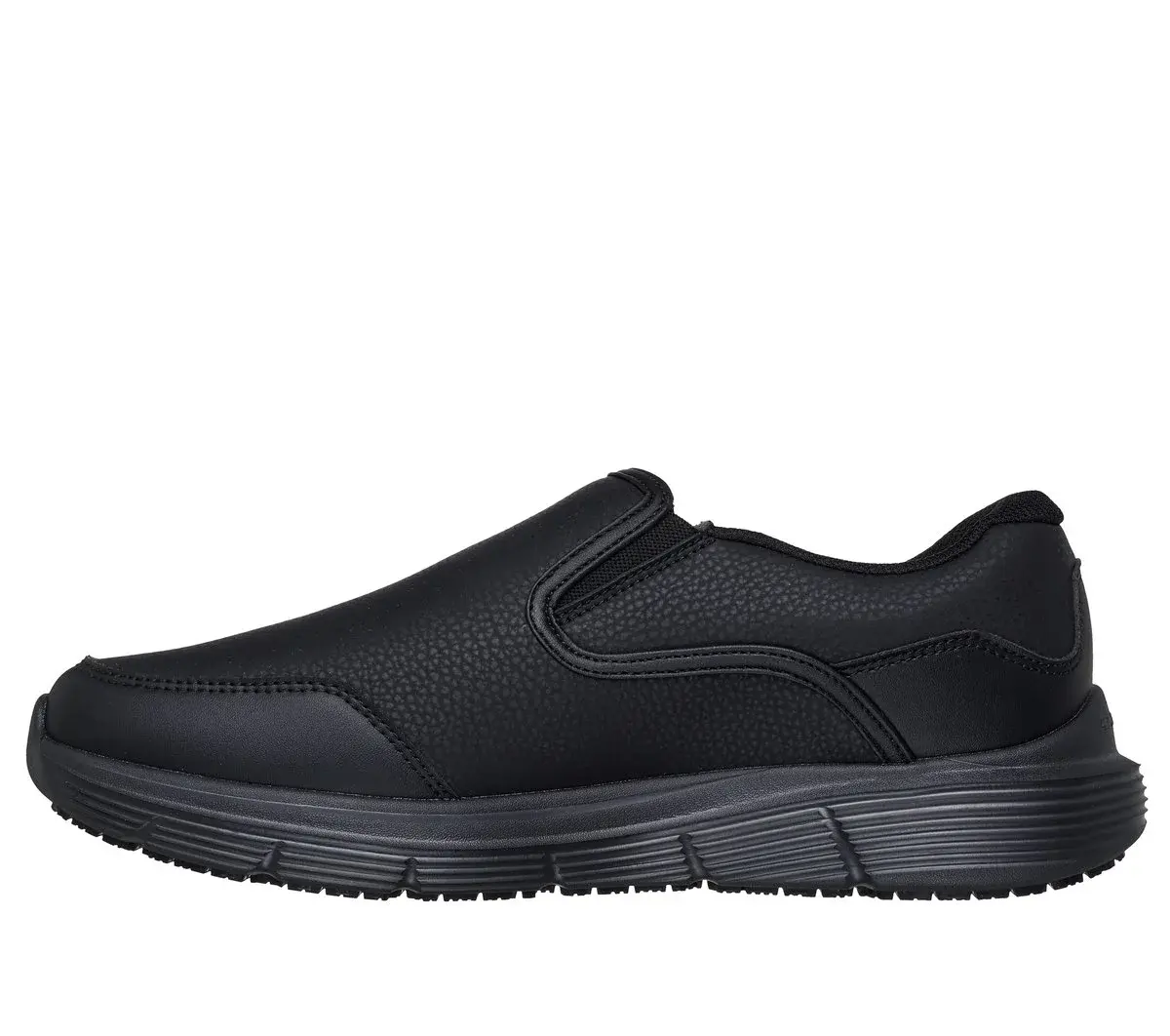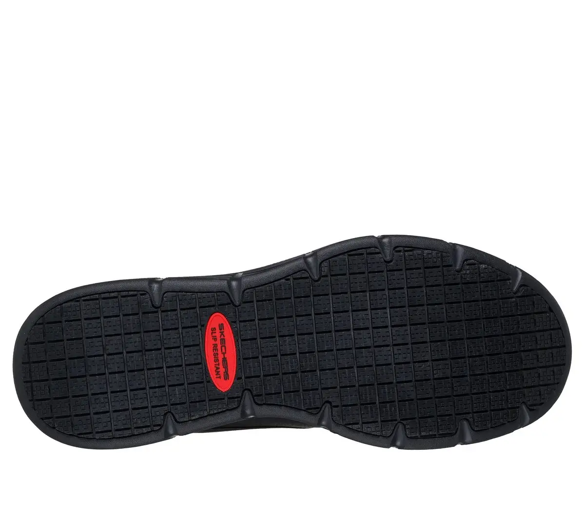 Take on your shift with no worries about your feet wearing Skechers Work™: Corart. This laceless work design features a textured faux leather upper with twin gore panels for ease of wear, a well-cushioned midsole, slip-resistant traction outsole, and a cushioned Skechers Memory Foam™ insole.