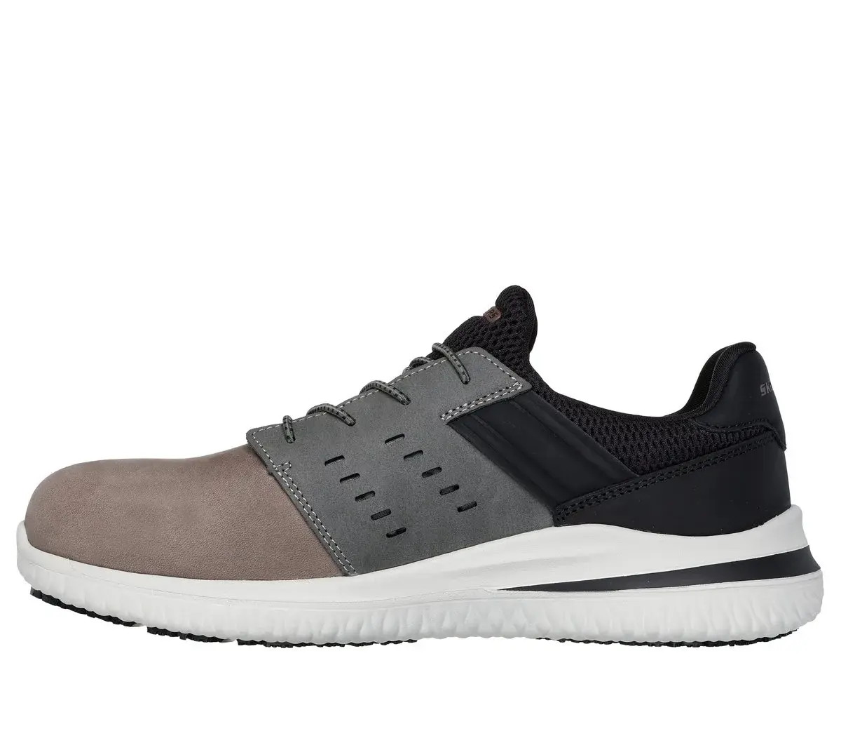 Surefooted comfort and safety deliver in Skechers Work™ Slip-Resistant: Delson 3.0 SR – Tyoll. This pull-on features a leather and synthetic upper with stretch laces, Skechers Air-Cooled Memory Foam® insole, carbon nano safety toe, and a slip-resistant outsole.