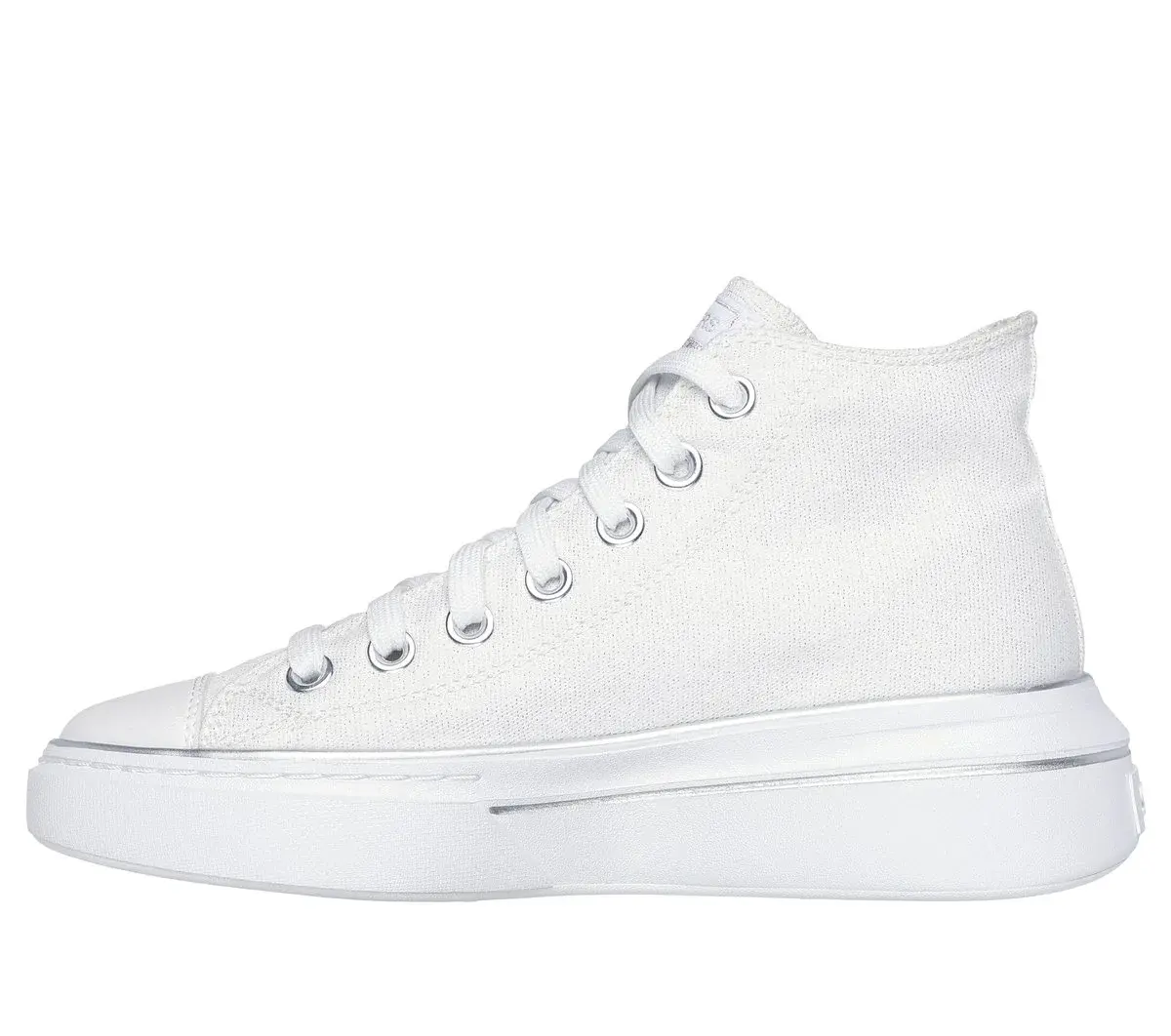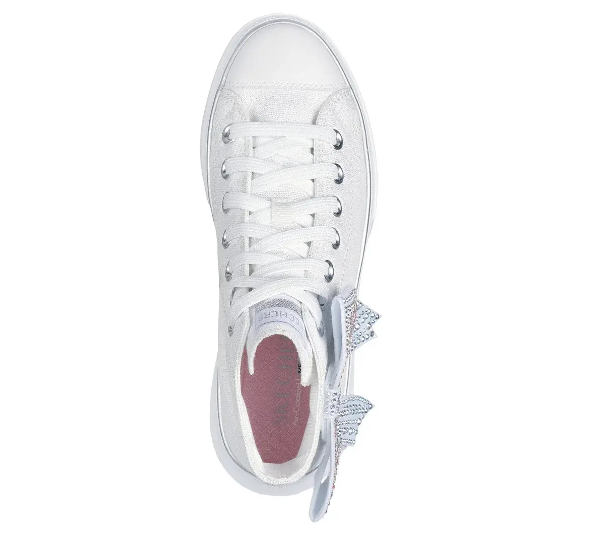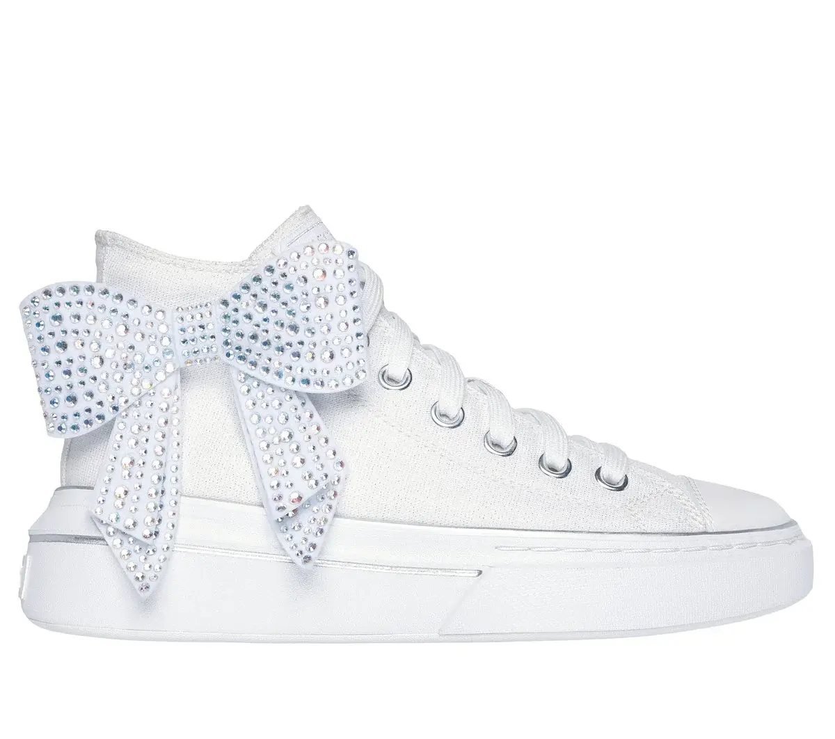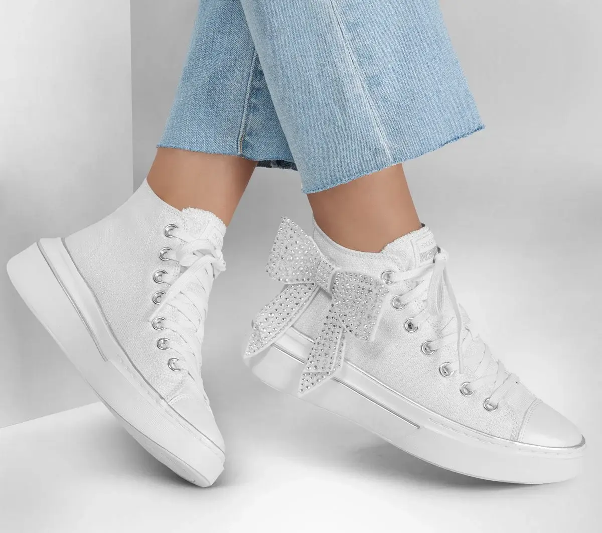 A clean court style gets a glam update in Skechers Cordova Classic – Tie The Knot. This lace-up fashion sneaker features a glitter canvas upper with a rhinestone embellished bow detail, and a cushioned Skechers Air-Cooled Memory Foam® insole.