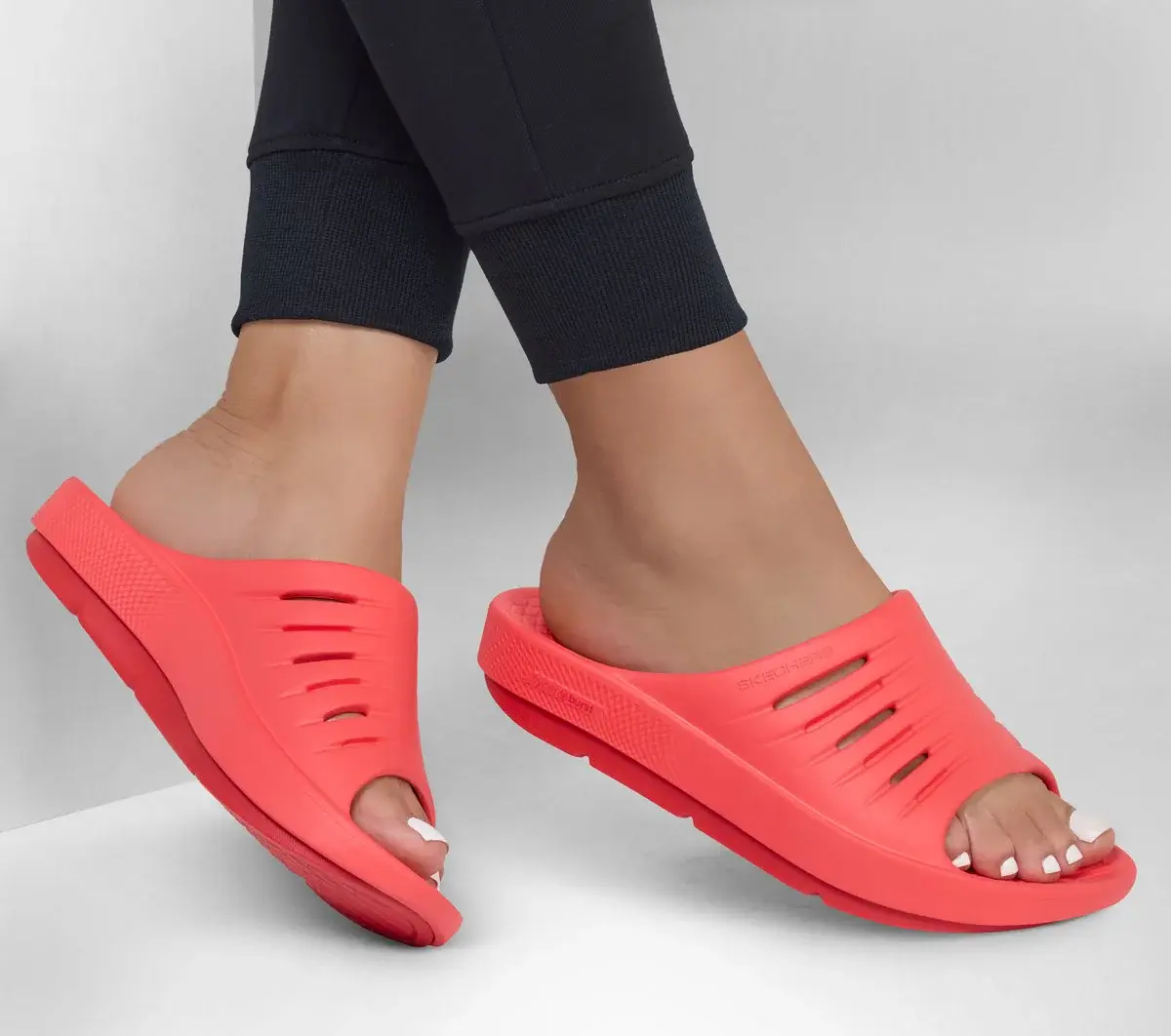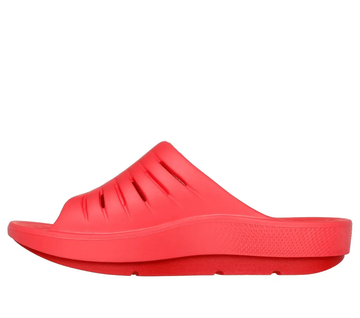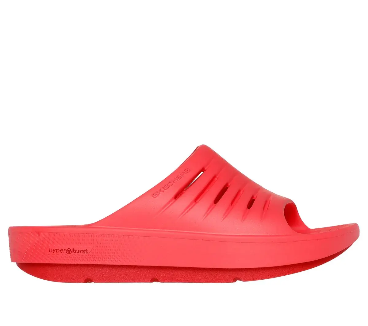 Relax in specialized comfort and style wearing Skechers GO RECOVER® Refresh. This athletic recovery slide sandal has been granted the APMA Seal of Acceptance and features a synthetic upper with linear perforations and premium HYPER BURST® foam with Arch Fit® support that redistributes pressure for impact reduction.