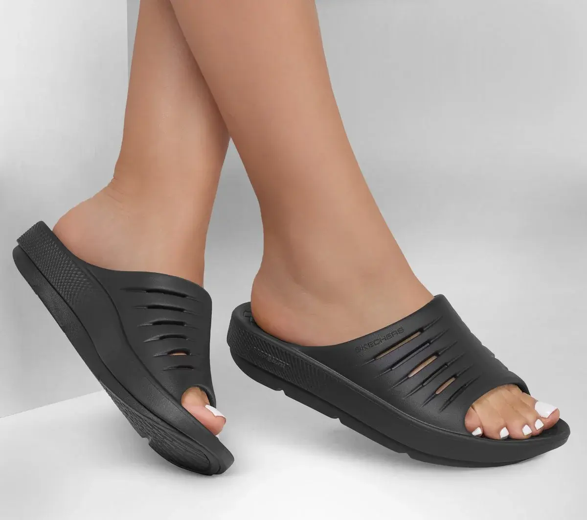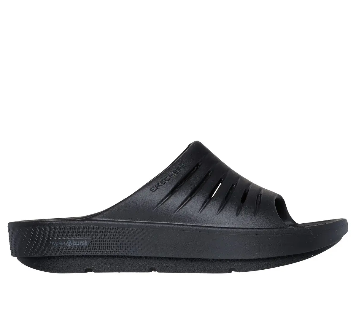 Relax in specialized comfort and style wearing Skechers GO RECOVER® Refresh. This athletic recovery slide sandal has been granted the APMA Seal of Acceptance and features a synthetic upper with linear perforations and premium HYPER BURST® foam with Arch Fit® support that redistributes pressure for impact reduction.