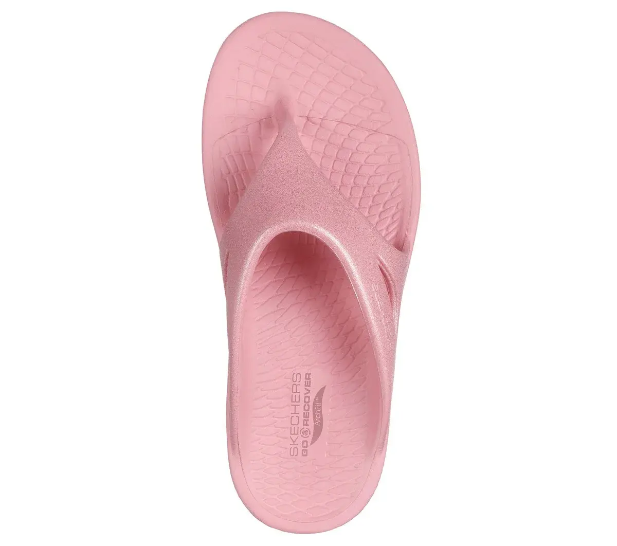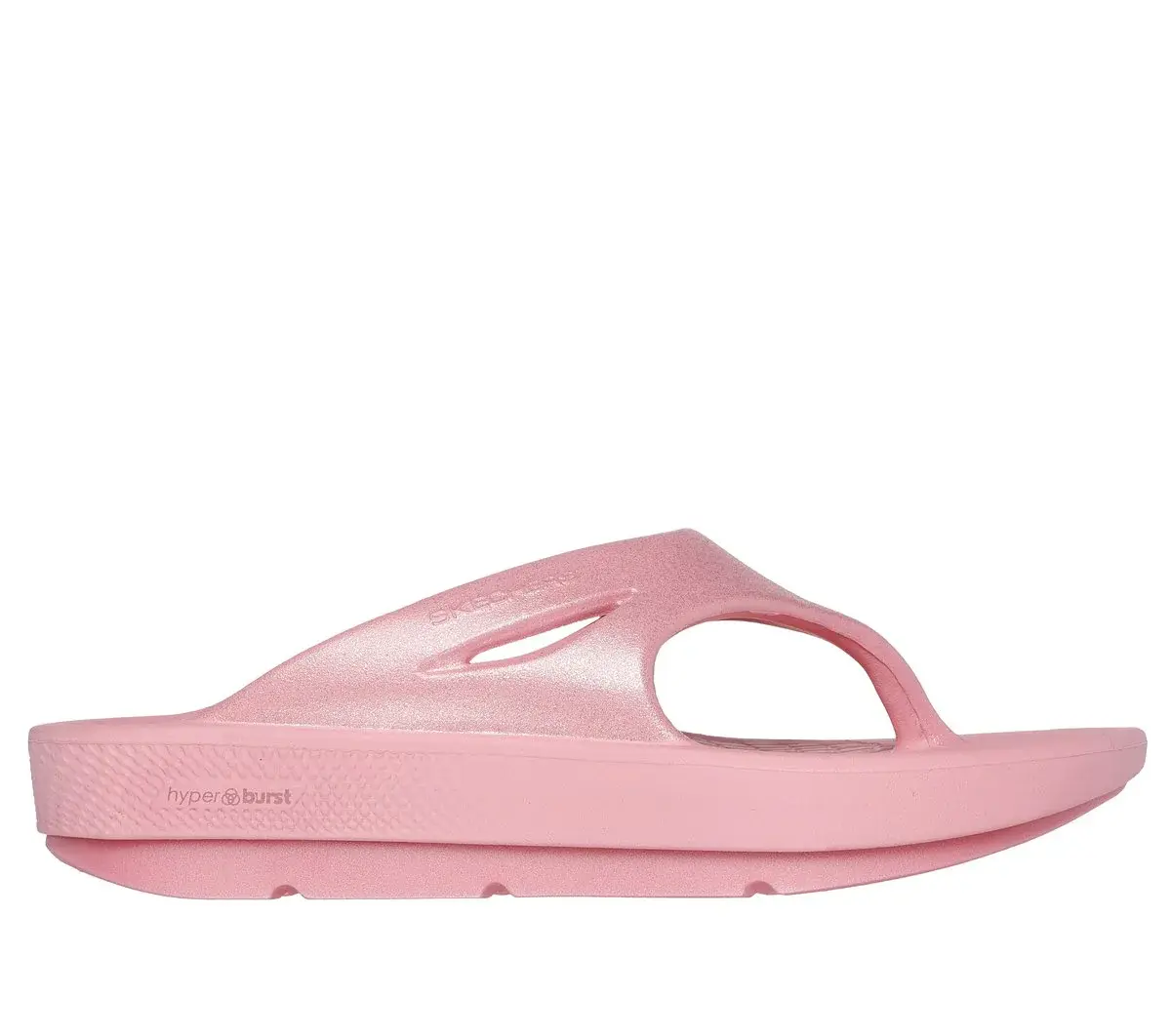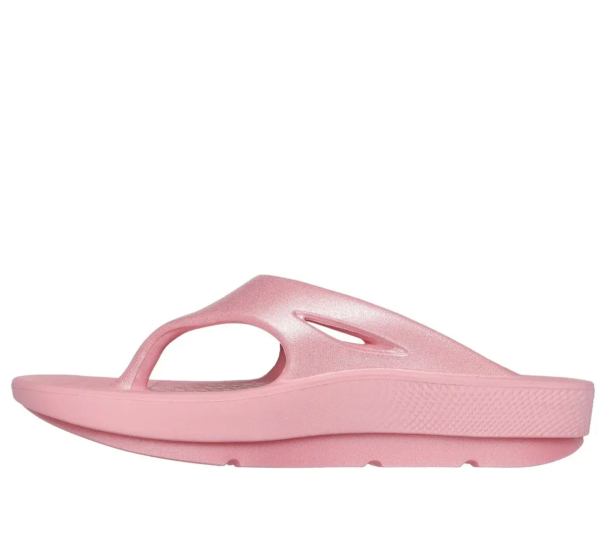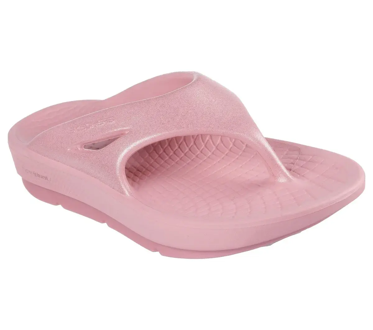 Super Critical® Relax in specialized comfort and style wearing Skechers GO RECOVER® Refresh – Glitzy. This athletic recovery thong sandal has been granted the APMA Seal of Acceptance and features a sparkly synthetic upper with premium Hyper Burst® foam, plus Arch Fit® support and a Lux Foam + contoured footbed.