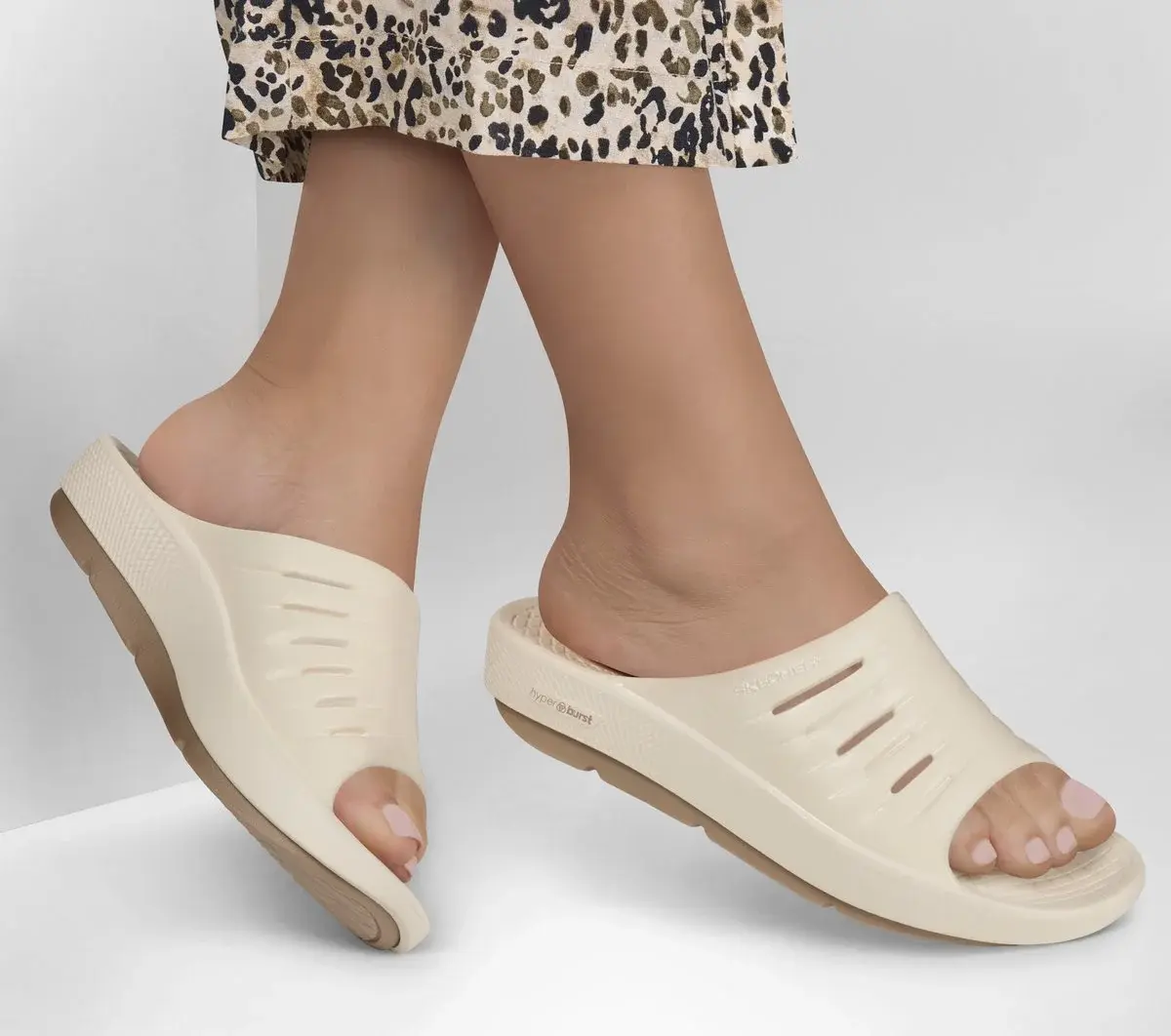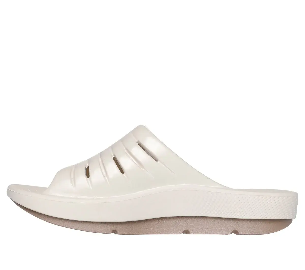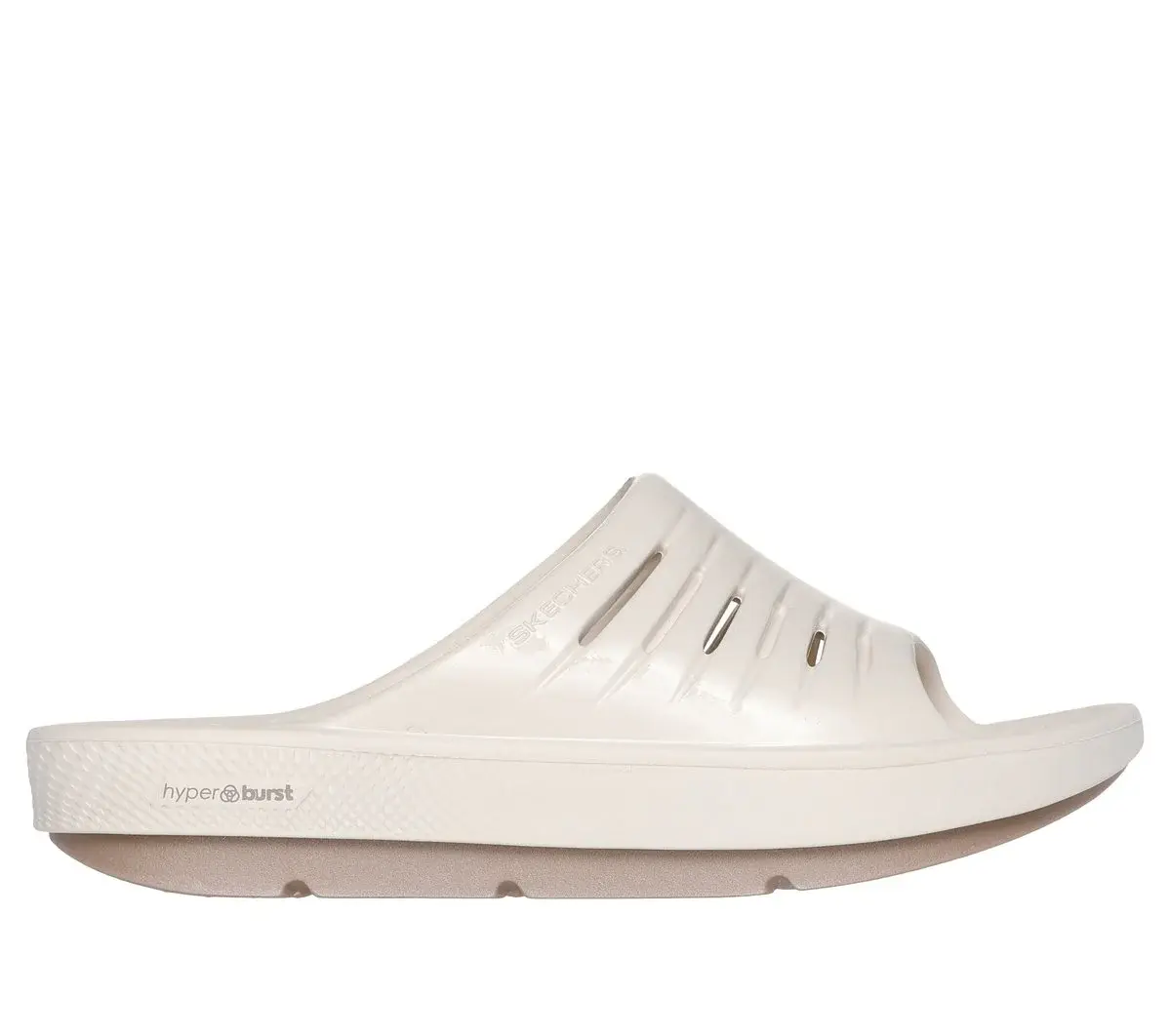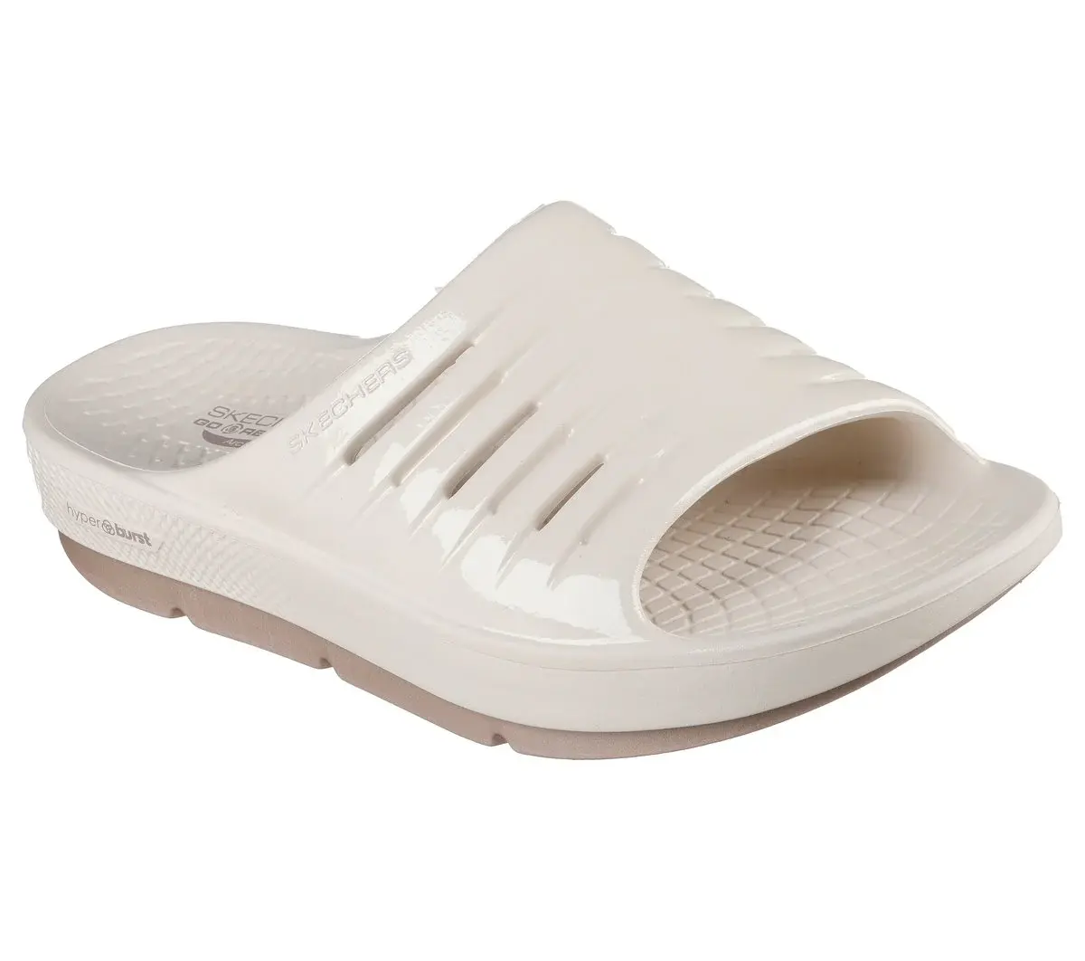 Relax in specialized comfort and style wearing Skechers GO RECOVER® Refresh – Glossy. This athletic recovery slide sandal has been granted the APMA Seal of Acceptance and features a high gloss synthetic upper with linear perforations, a ultra-soft Lux Foam+ footbed, and premium HYPER BURST® foam with Arch Fit® support that redistributes pressure for impact reduction.