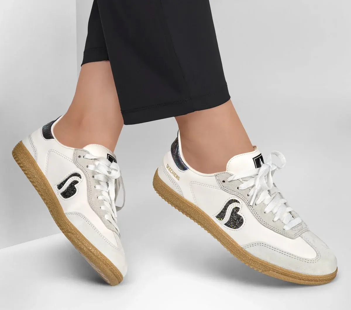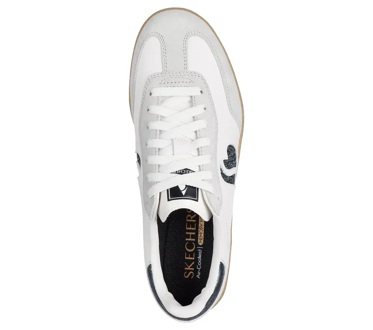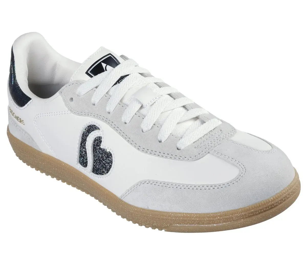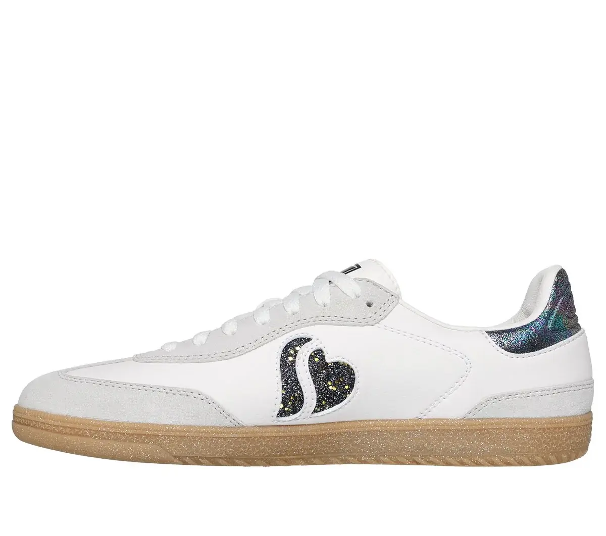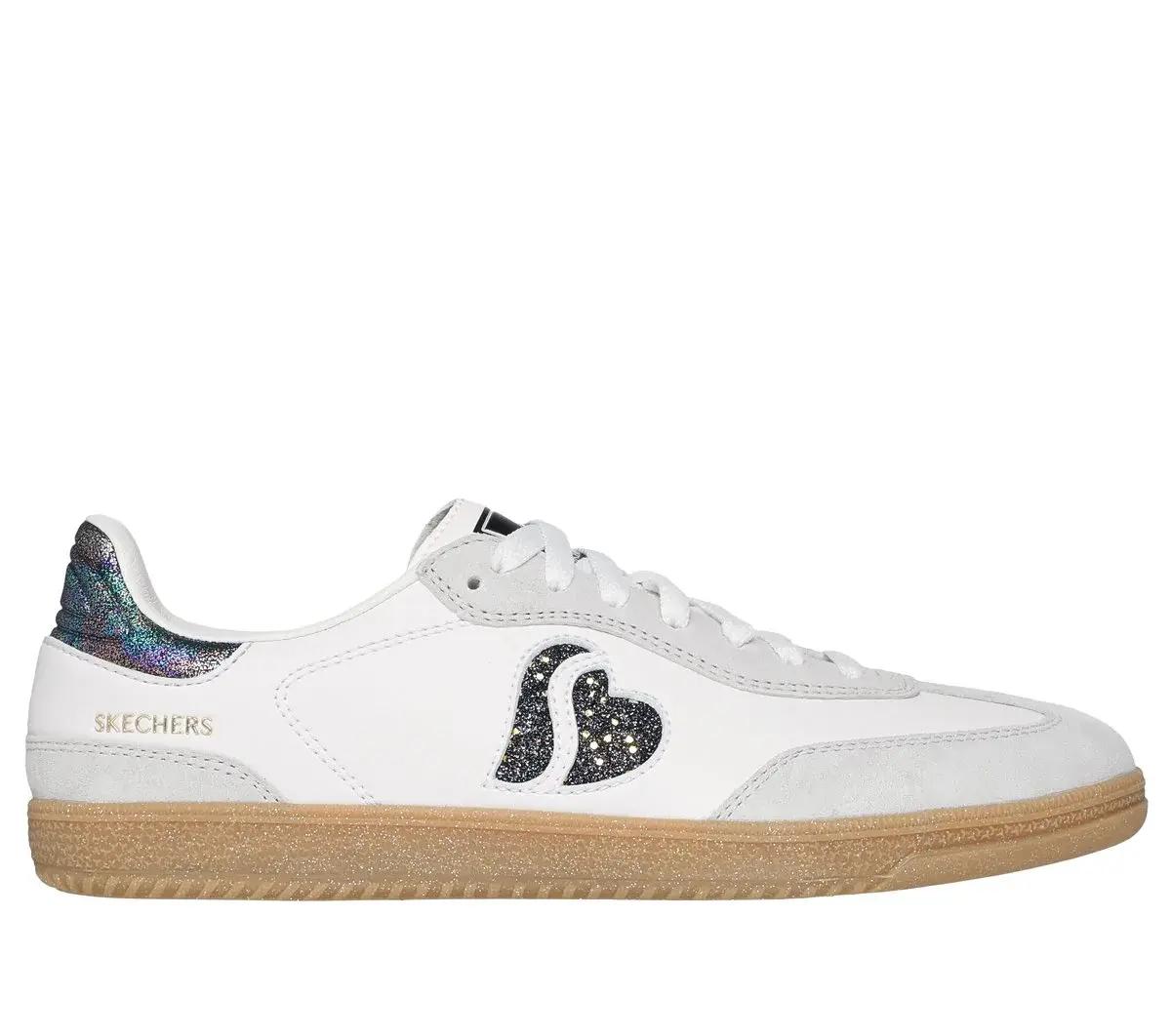 Feel the love of comfort in sparkling fashion wearing Skechers Hotshot – Electric Heart. This lace-up court-style sneaker features a duraleather and suede overlay upper with glitter-embellished S-heart quarter detail and a cushioned Skechers Air-Cooled Memory Foam® insole.
