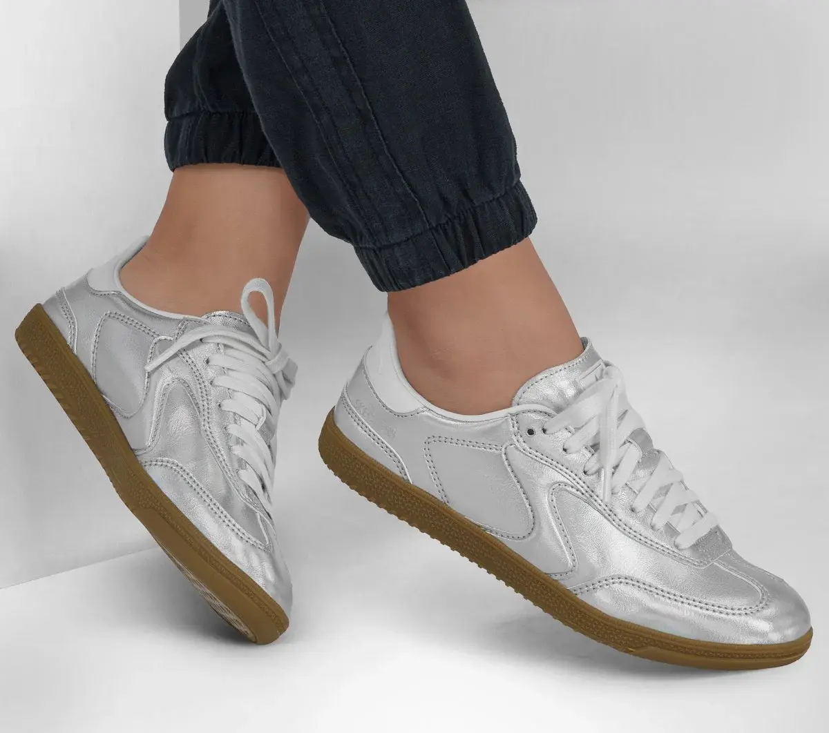 IT’S THE S® A modern classic meets fresh comfort in Skechers Hotshot – True Iridescence. This lace-up court-style sneaker features a synthetic metallic upper with an iridescent finish, ‘S’ quarter logo, and a cushioned Skechers Air-Cooled Memory Foam® insole.