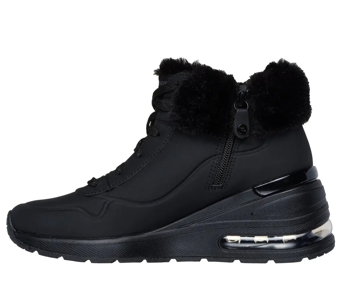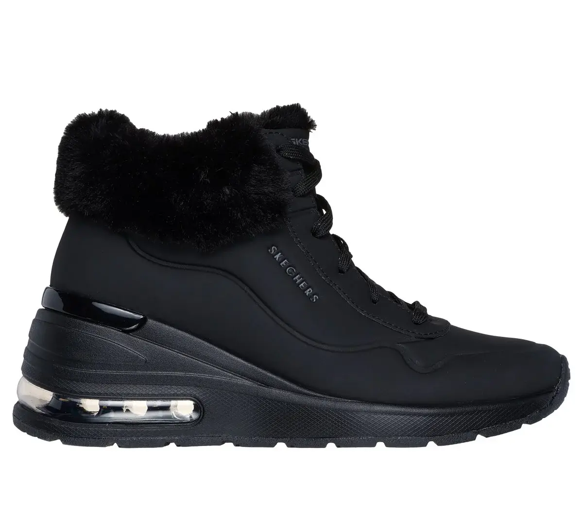 Chilly weather style meets sporty comfort in Skechers Million Air – Elevated Fall Air. This lace-up, wedge-fit sneaker boot features a durabuck upper with faux-fur collar and lining, side zip closure, Skechers Air-Cooled Memory Foam® insole, and a Skech-Air® visible airbag midsole.