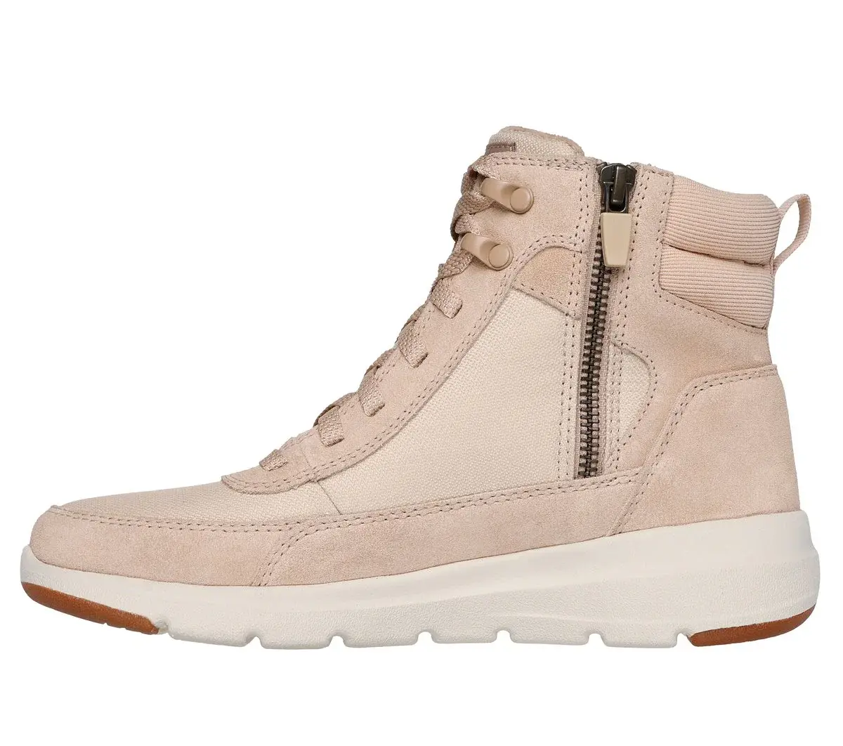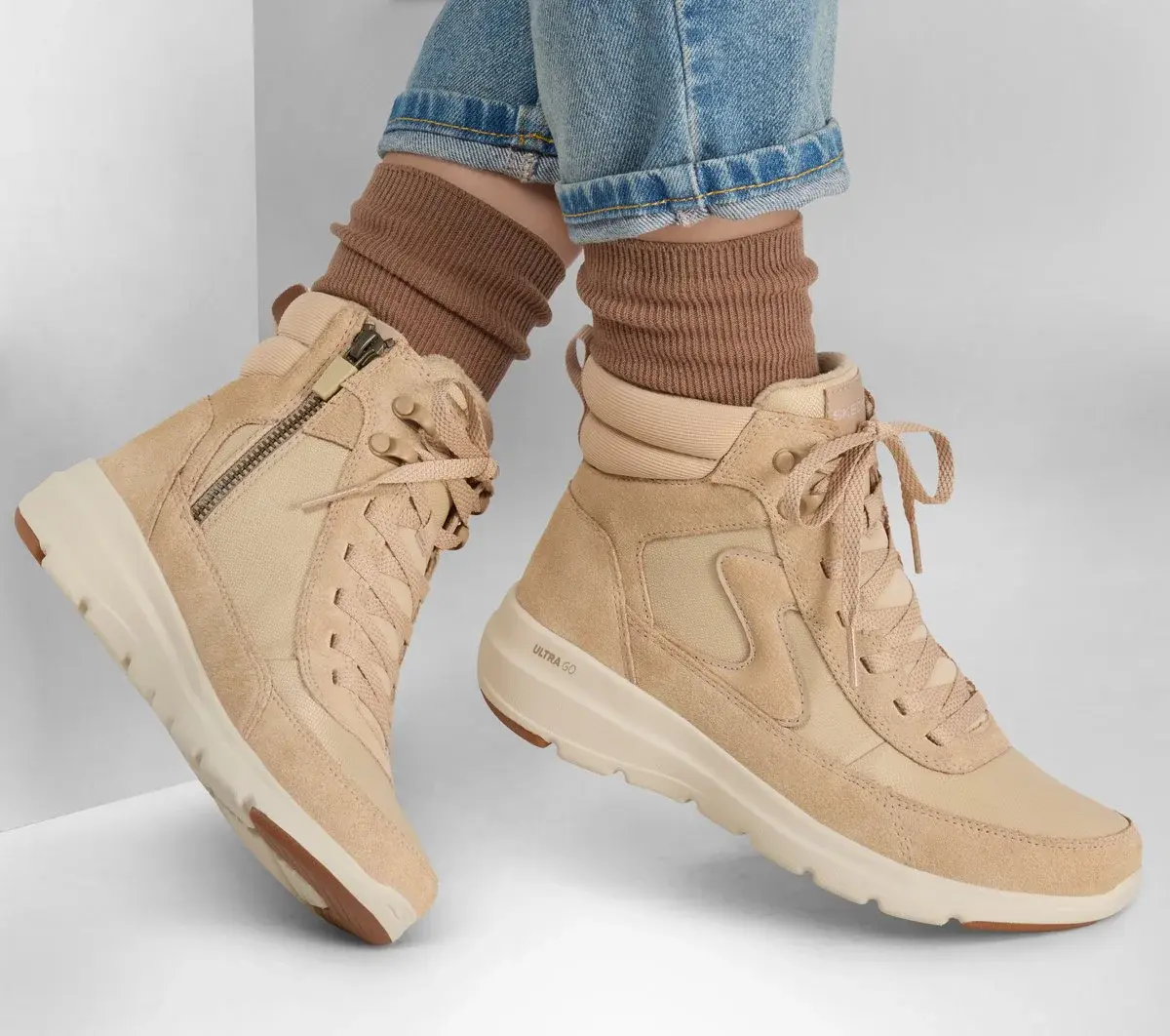 Stay on trend and in comfort wearing Skechers On-the-GO® Glacial Ultra – Wanderlust. This lace-up sneaker boot features a 3M® Scotchgard® treated suede and canvas upper with a side-zip closure, padded collar, Skechers Air-Cooled Goga Mat™ insole, and lightweight ULTRA GO® cushioning.