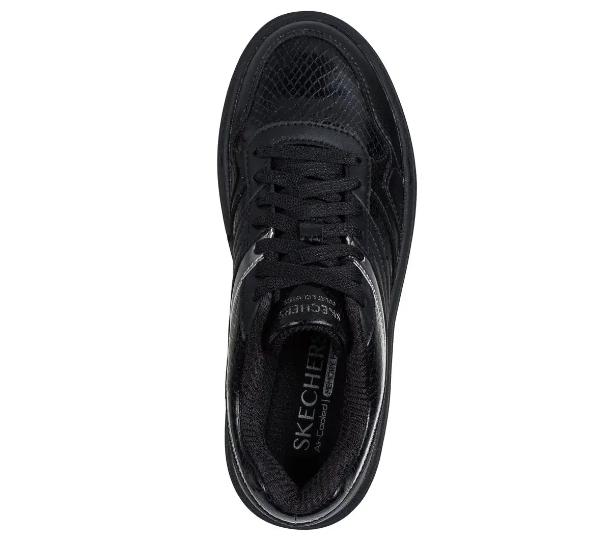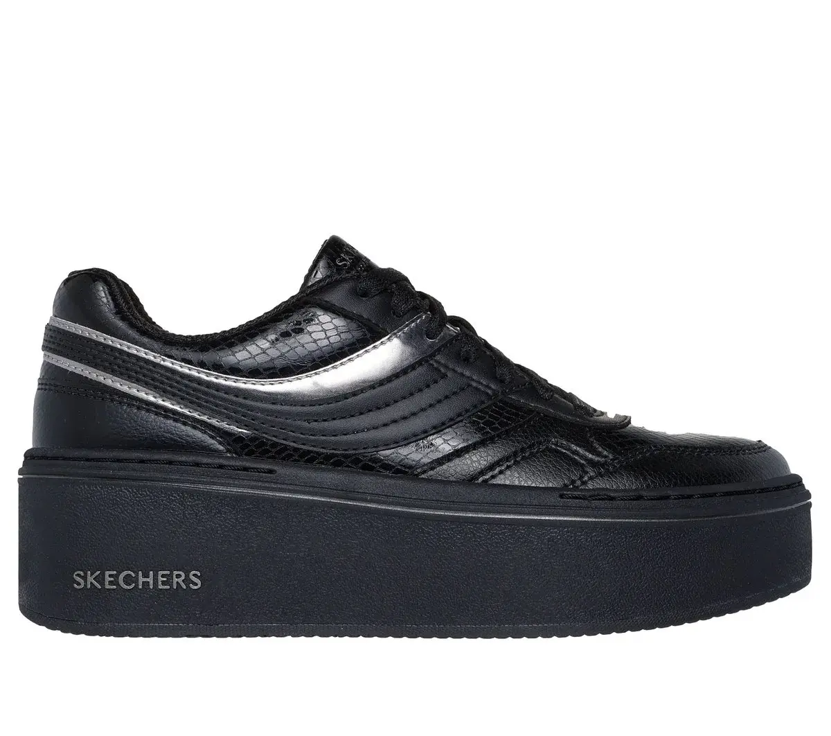 Reach new heights of style with Skechers Paloma – Lifted Glow. This platform court sneaker features a lace-up duraleather upper with reptile textured details and metallic overlays, plus a cushioned Skechers Air-Cooled Memory Foam® comfort insole.