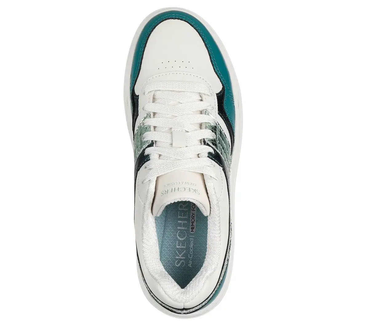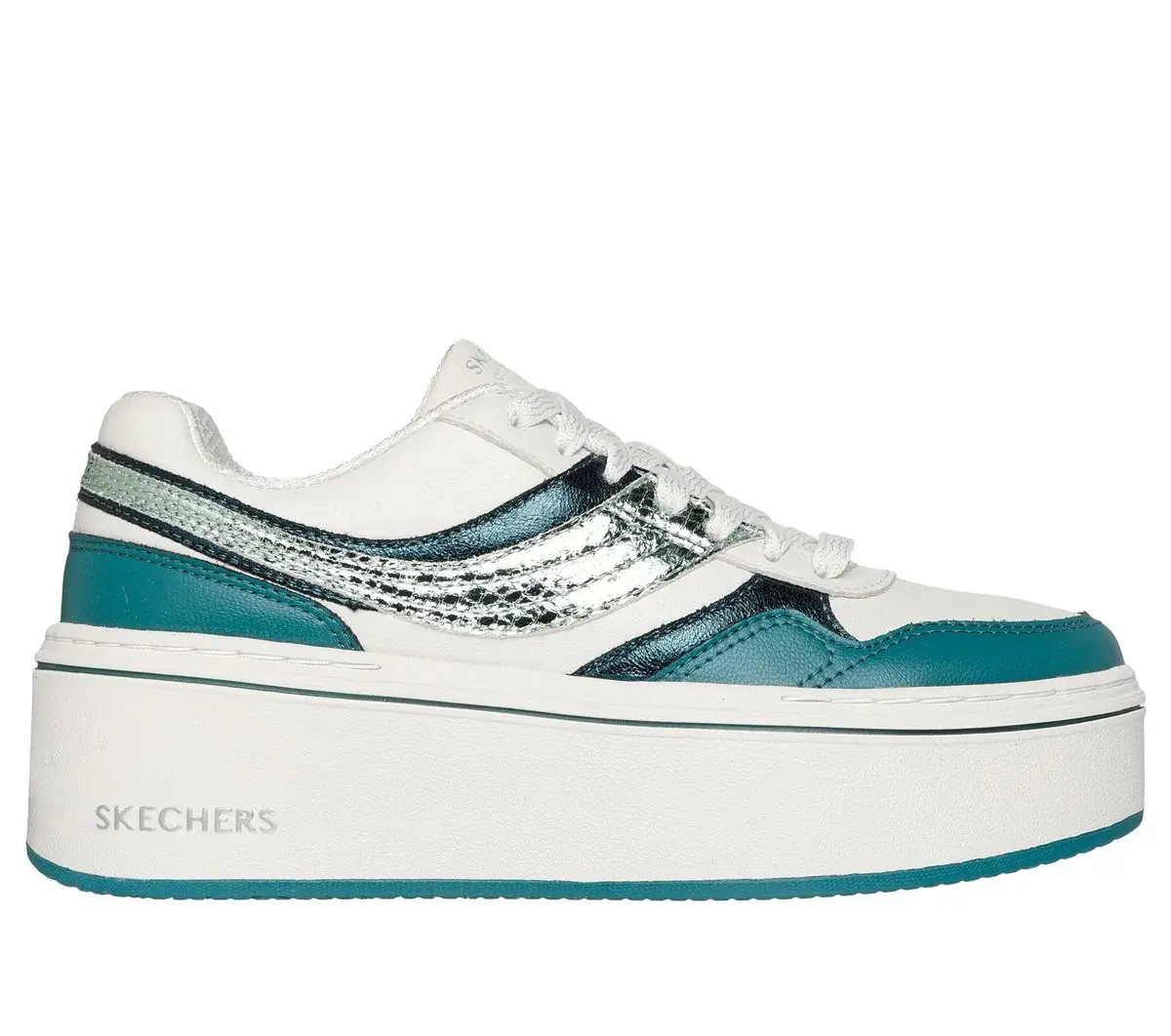 Reach new heights of style with Skechers Paloma – Shimmer Takes All. This platform court sneaker features a lace-up duraleather upper with reptile-textured metallic overlays, plus a cushioned Skechers Air-Cooled Memory Foam® comfort insole.