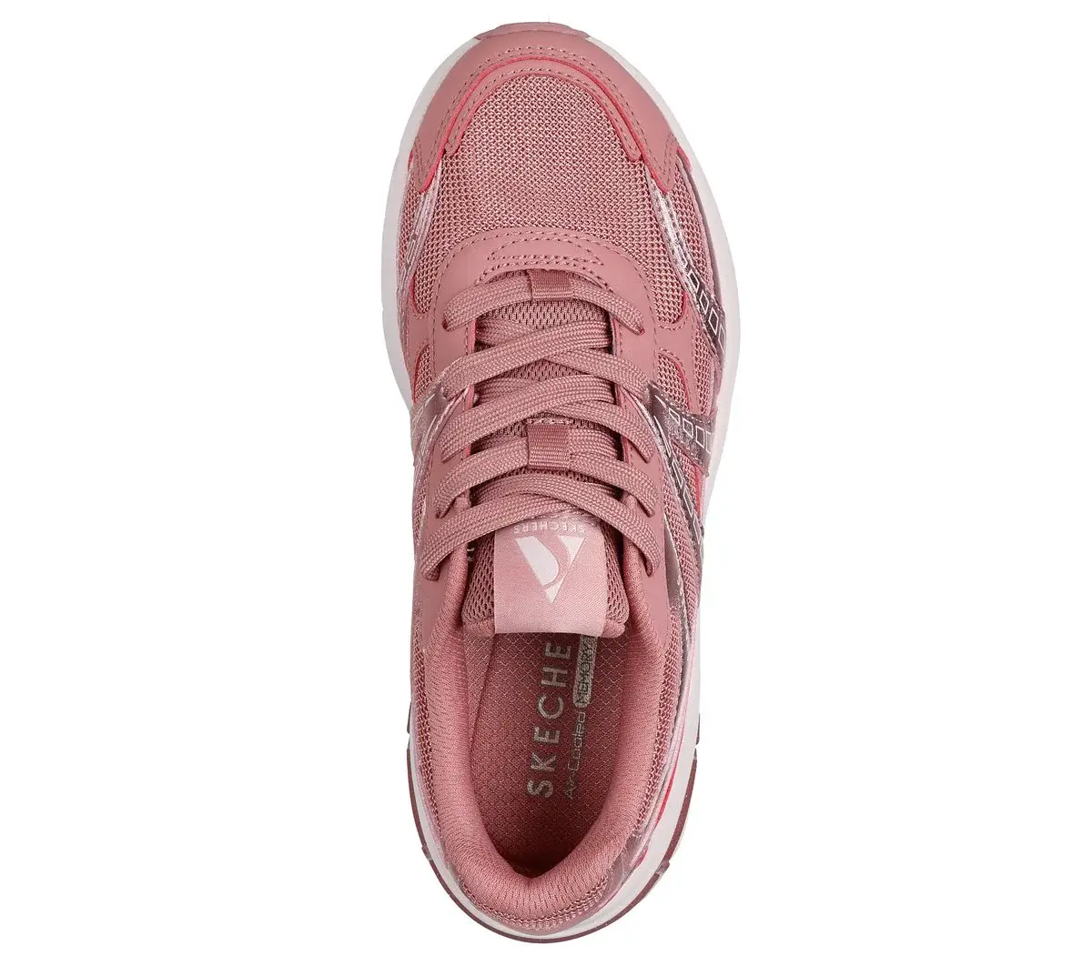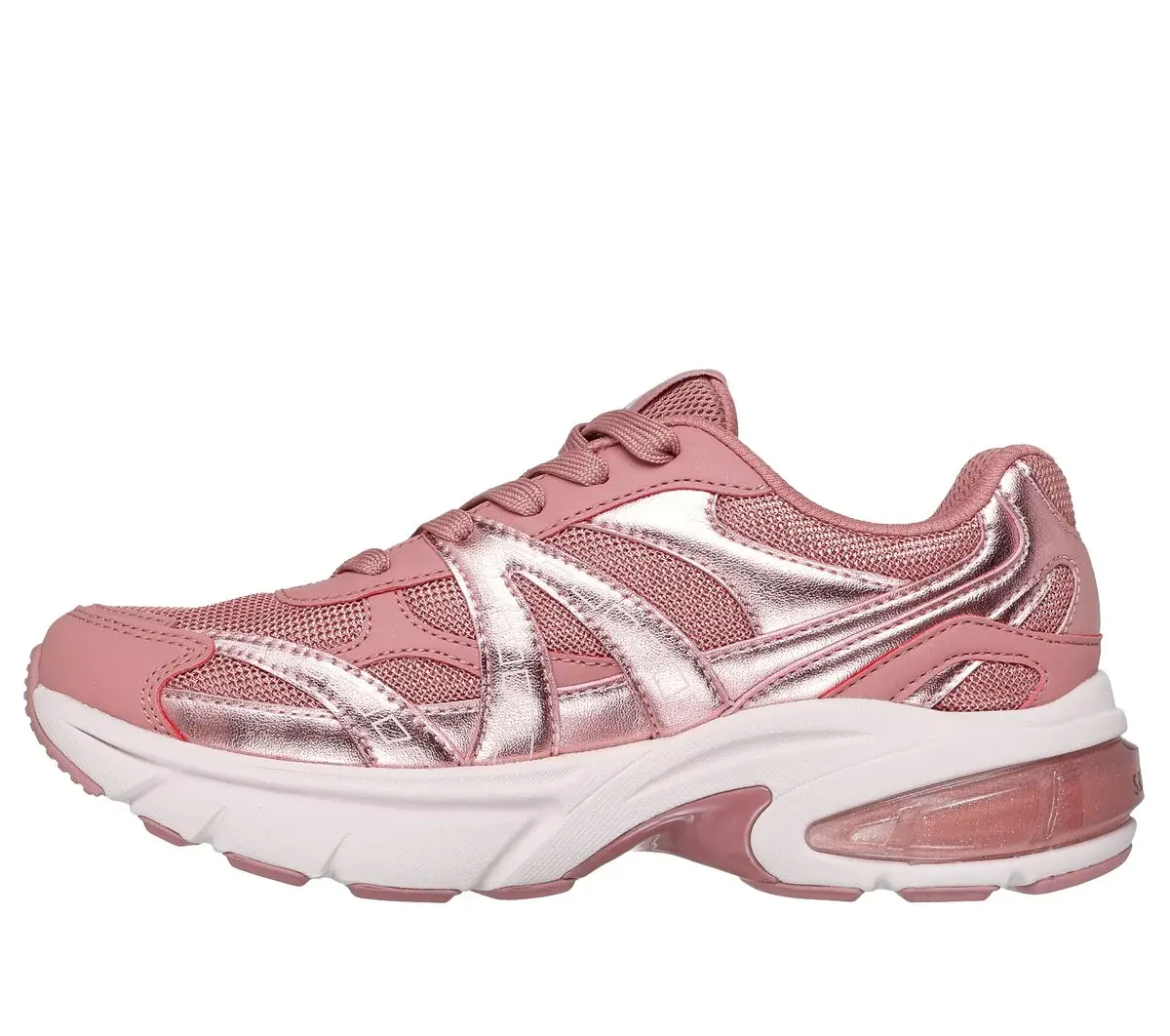 Show off your sporty diva style wearing Skechers Street™ Skechers Shadow – Stellar 90. This lace-up fashion sneaker features a metallic duraleather and mesh upper with a translucent midsole insert and cushioned Skechers Air-Cooled Memory Foam® insole.