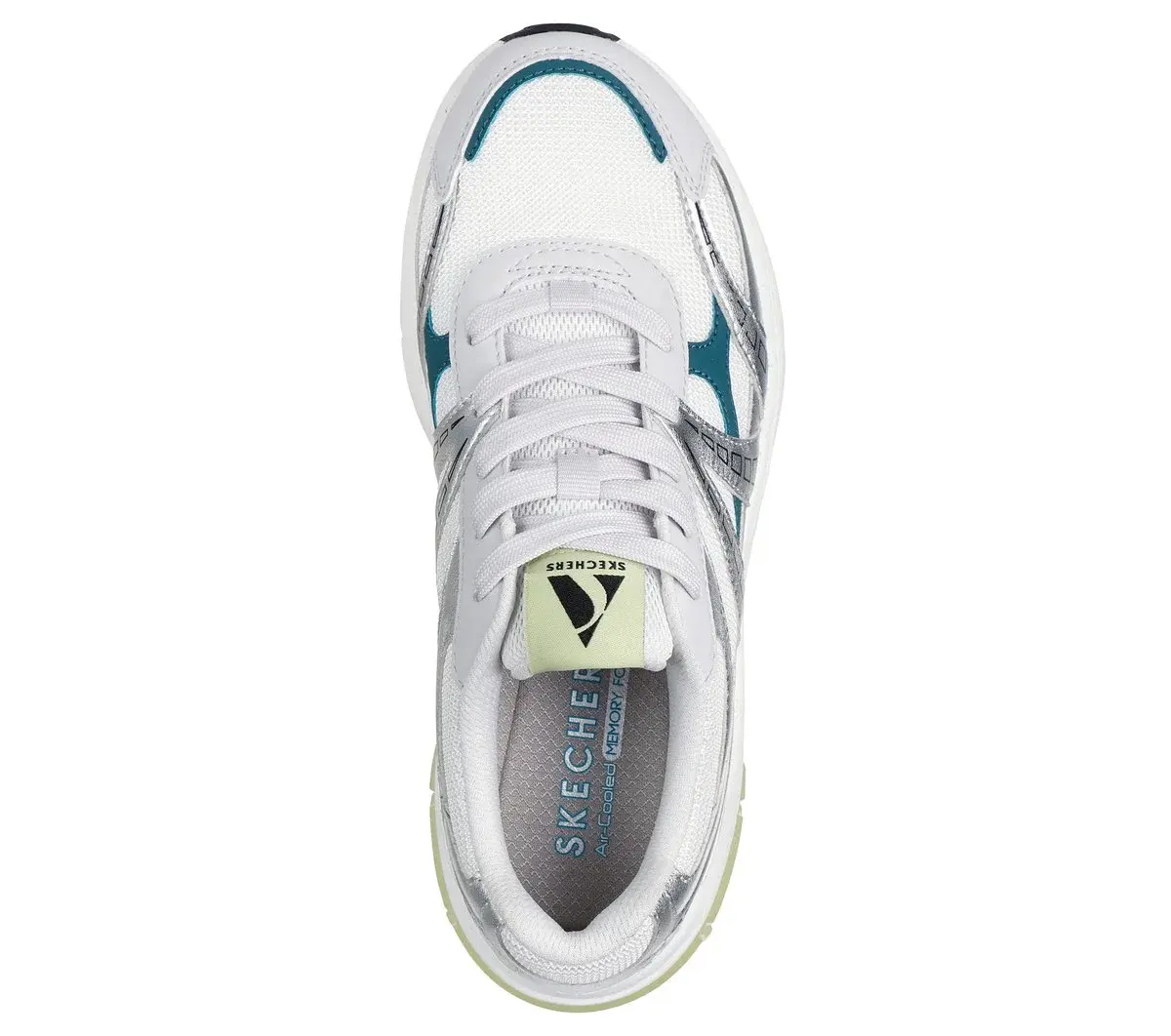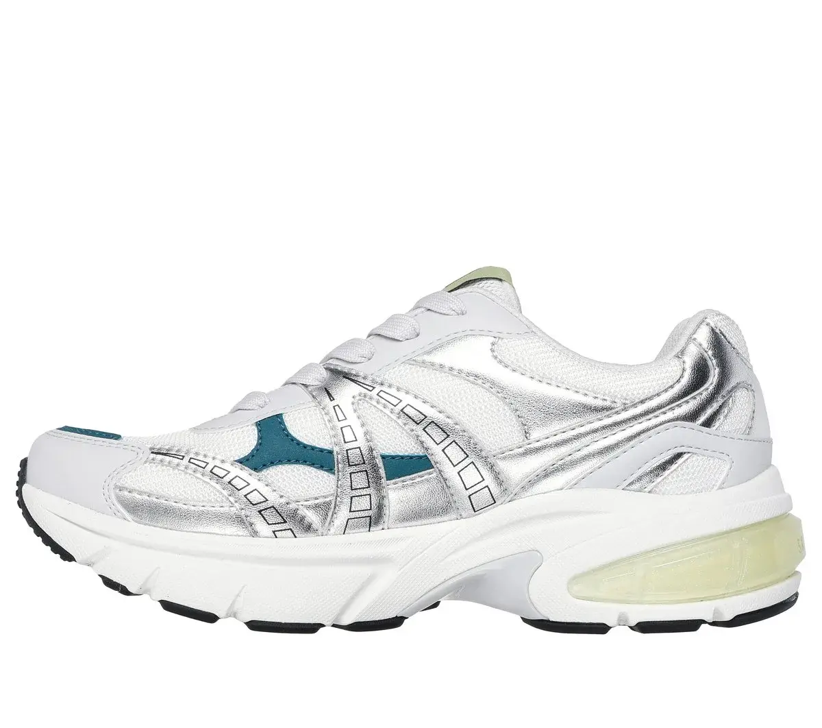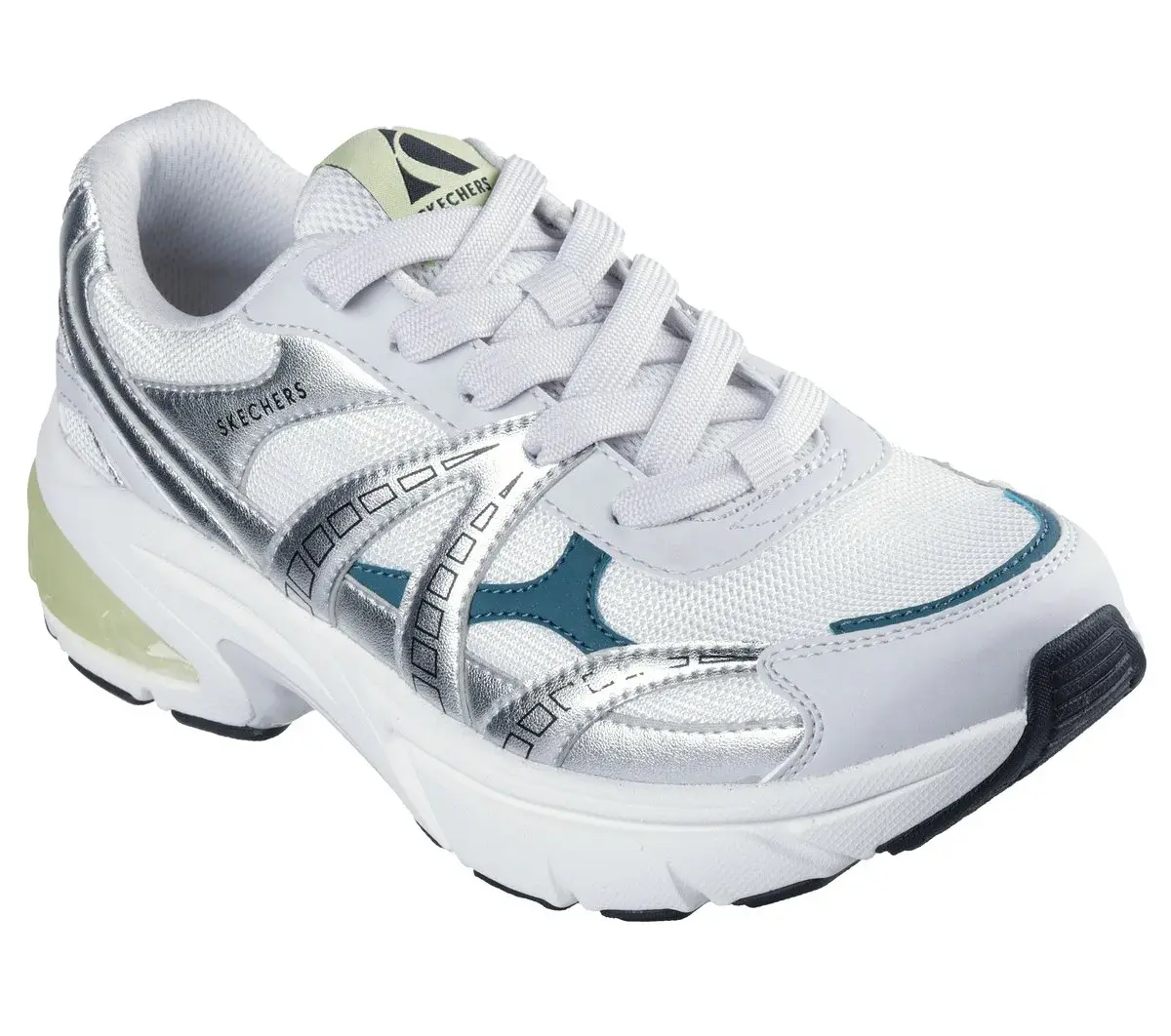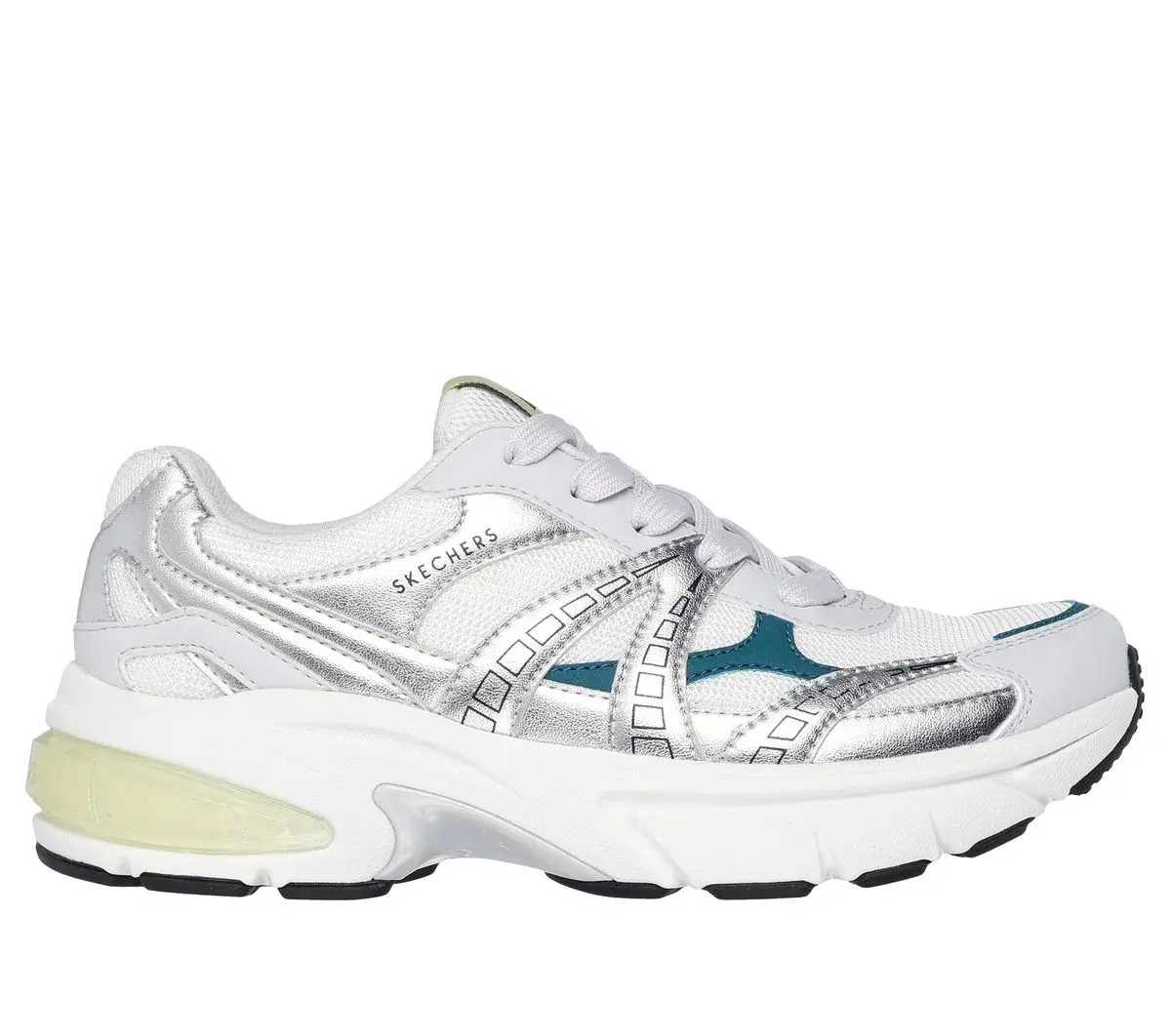 Show off your sporty diva style wearing Skechers Street™ Skechers Shadow – Stellar 90. This lace-up fashion sneaker features a metallic duraleather and mesh upper with a translucent midsole insert and cushioned Skechers Air-Cooled Memory Foam® insole.