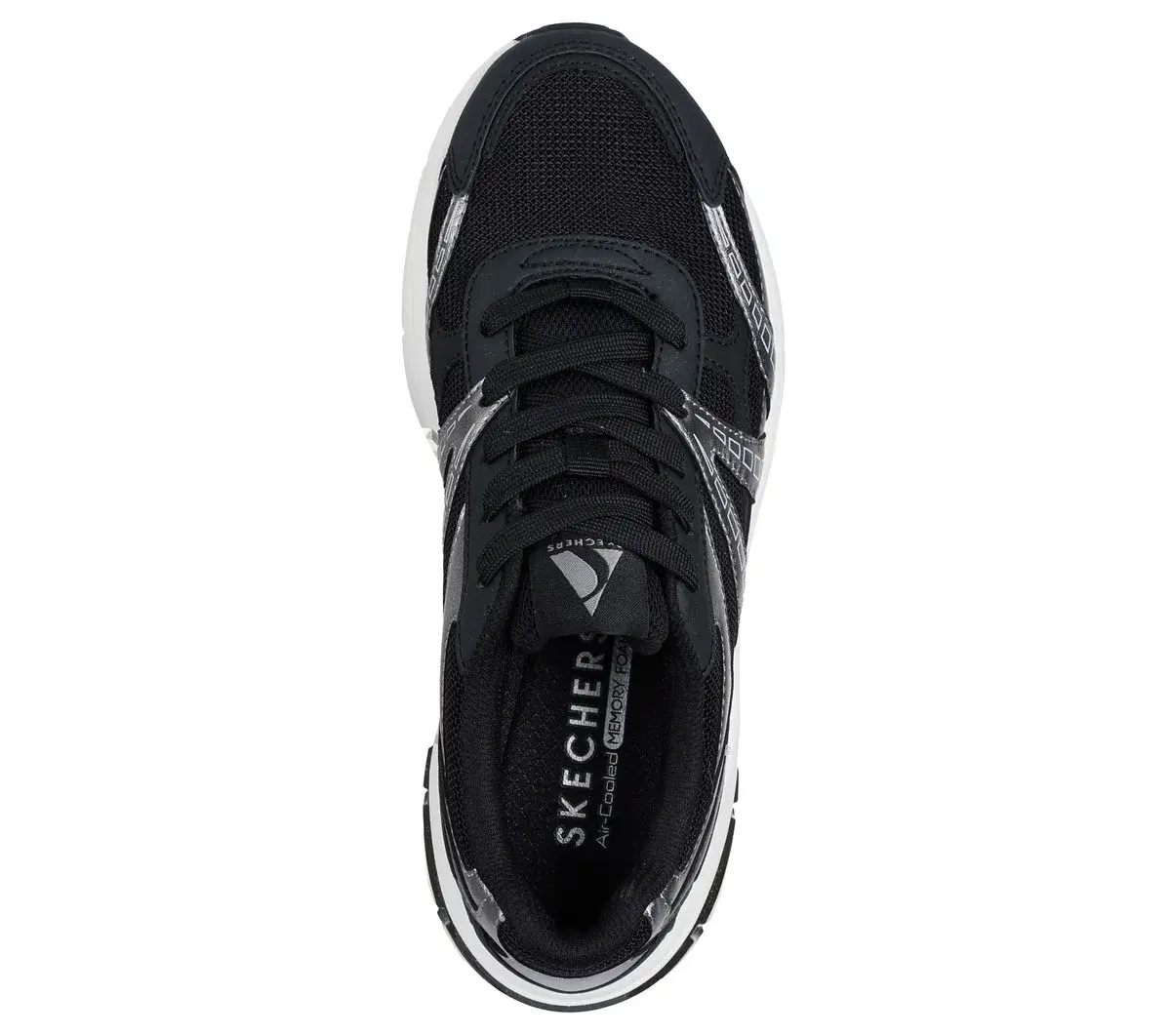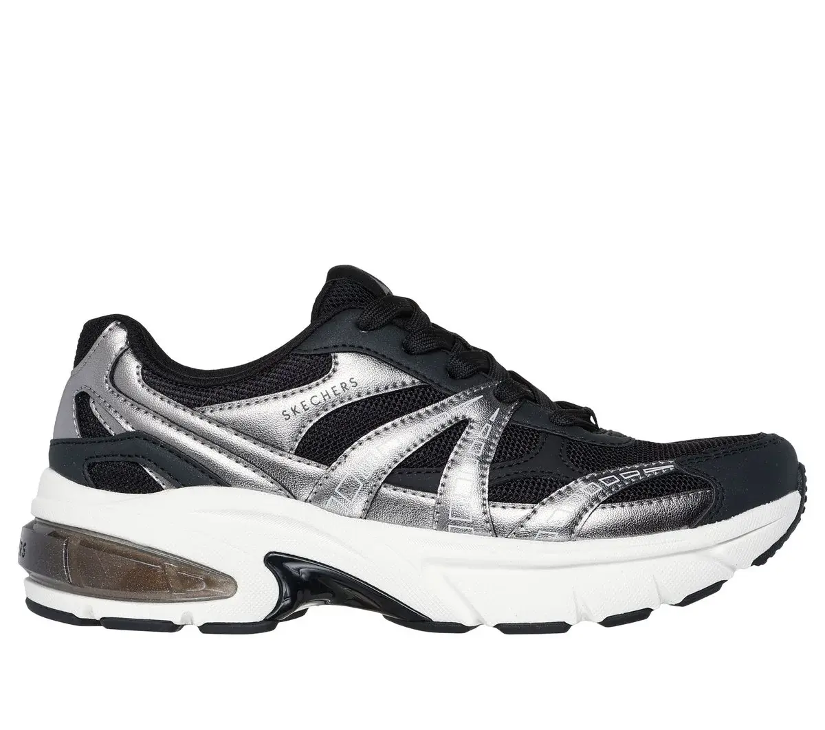 Show off your sporty diva style wearing Skechers Street™ Skechers Shadow – Stellar 90. This lace-up fashion sneaker features a metallic duraleather and mesh upper with a translucent midsole insert and cushioned Skechers Air-Cooled Memory Foam® insole.
