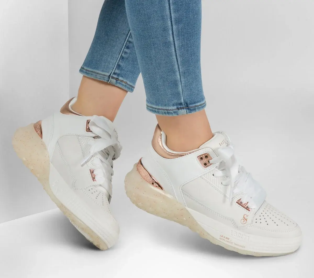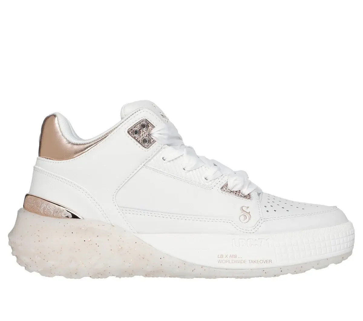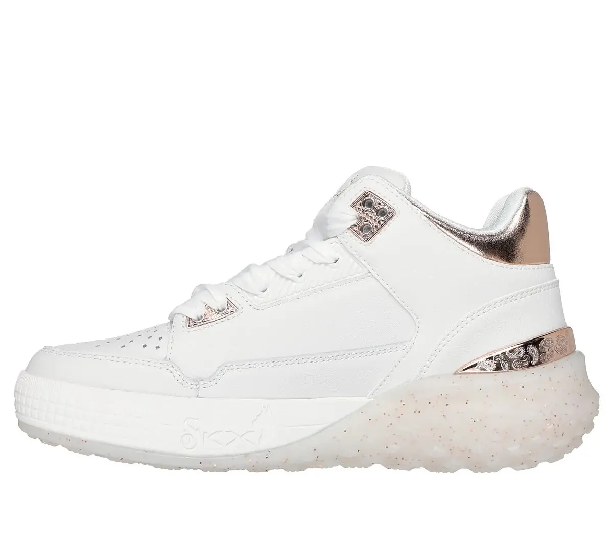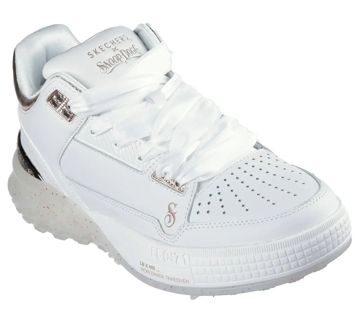 Dropping like it’s hot: Skechers x Snoop Dogg: Sizzle – Buckets. This fly and fresh mid-top court style is as unique as the D-O-Double G himself. Featuring a smooth and perforated premium leather upper with metallic collar and heel trim, a glitter-speckled outsole, and an oh-so-cushy Skechers Air-Cooled Memory Foam® insole.