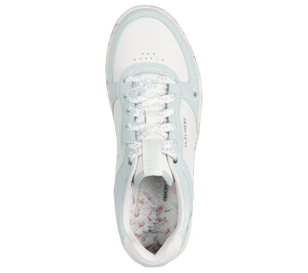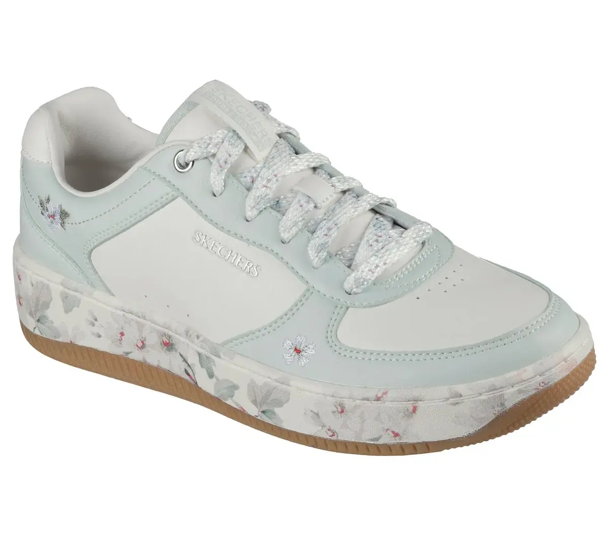 Watch your style bloom with Skechers Sport Court 2.0 – Floral Frenzy. This lace-up court style features a duraleather upper, floral print along the midsole, and a cushioned Skechers Air-Cooled Memory Foam® insole.