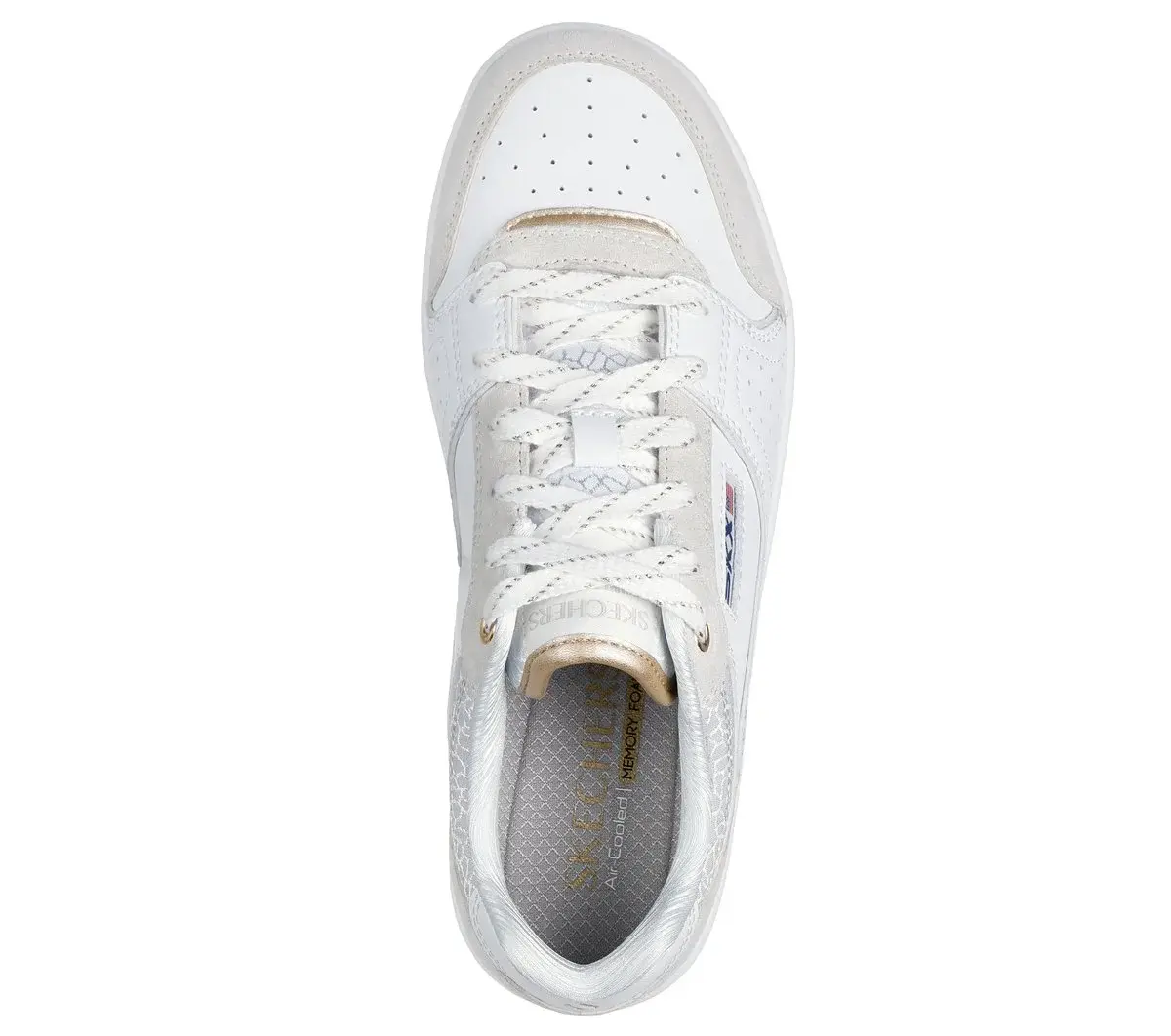 Casual modern style and comfort combine in Skechers Sport Court 2.0 – Metallic Break. Featuring a sleek court silhouette, this lace-up boasts a duraleather and pig suede upper with metallic trim, complemented by a cushioned Skechers Air-Cooled Memory Foam® insole.